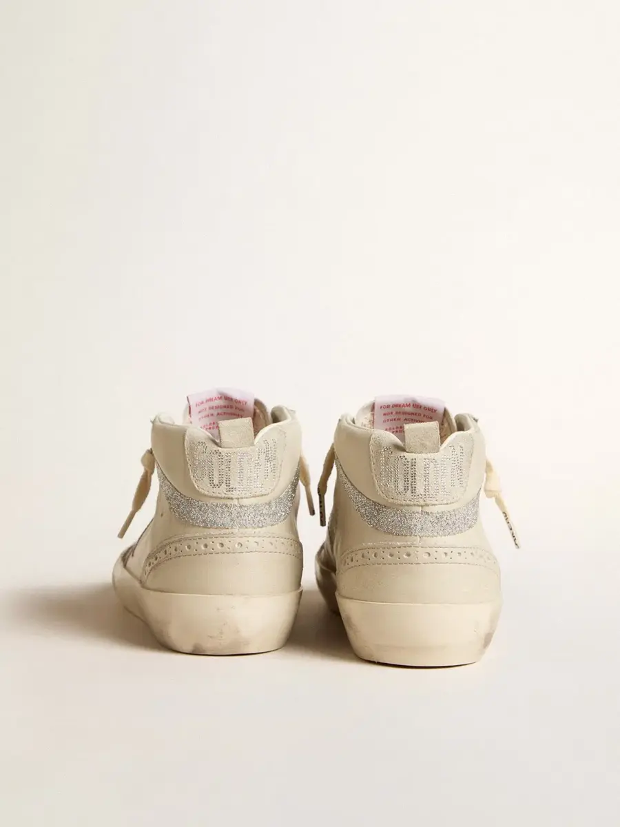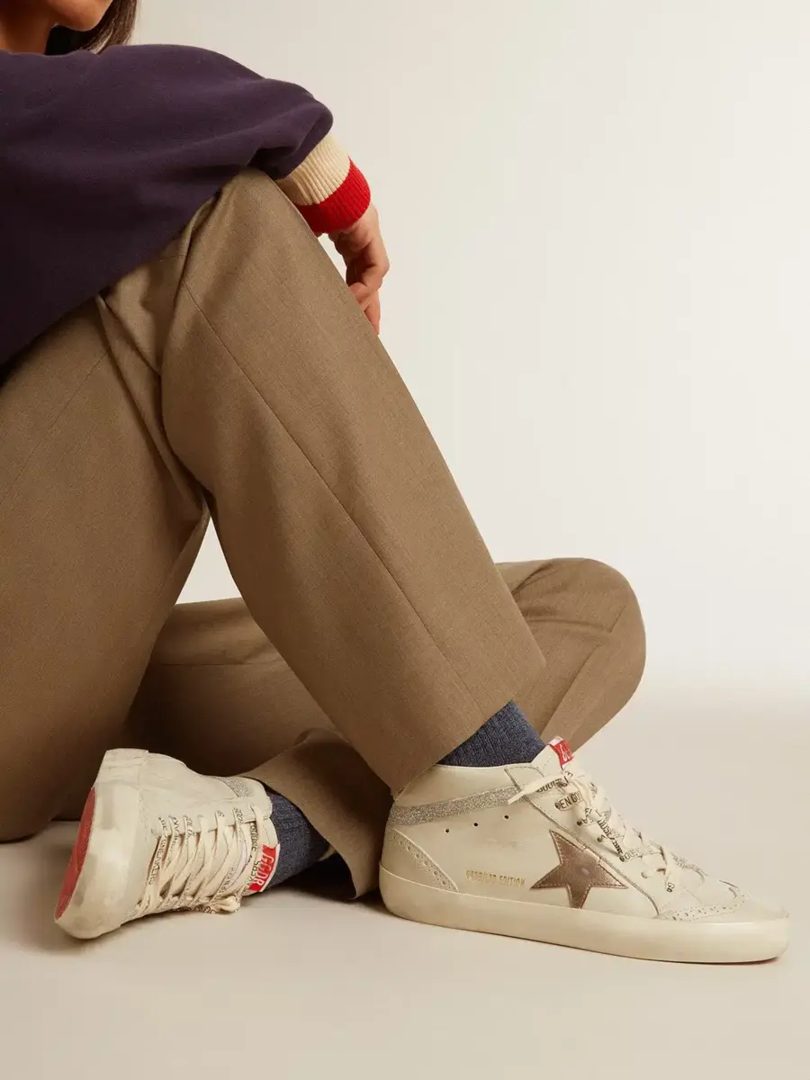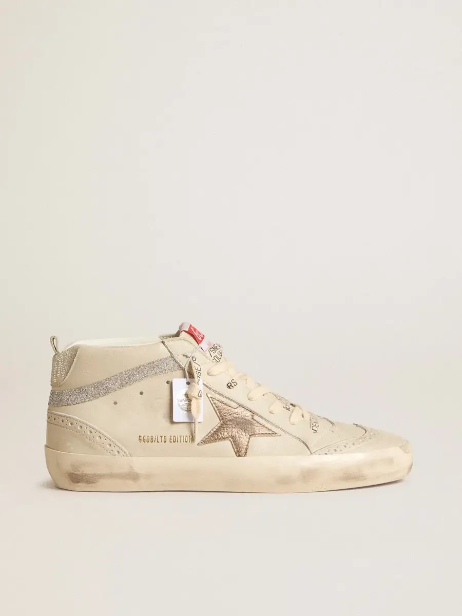 Versatilidad única y elegante: las zapatillas Mid Star aportan un toque refinado a su inspiración en la escena skater de los noventa. Este modelo con parte superior de piel blanca cuenta con una estrella de piel metalizada en color bronce y un destello decorado con microcristales Swarovski en color plata. La lengüeta del talón de ante gris hielo decorada con cristales Swarovski plateados y los cordones blancos con el logotipo negro en contraste completan el look.