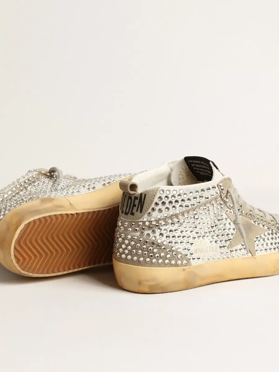 Versatilidad única y elegante: las zapatillas Mid Star aportan un toque refinado a su inspiración en la escena del skate de los años ochenta. Este modelo para mujer con parte superior de ante blanco cuenta con inserciones de ante gris paloma, como la estrella y el flash, y un motivo de cristales Swarovski en toda la superficie. La lengüeta del talón de ante gris paloma y los cordones gris hielo completan el look.