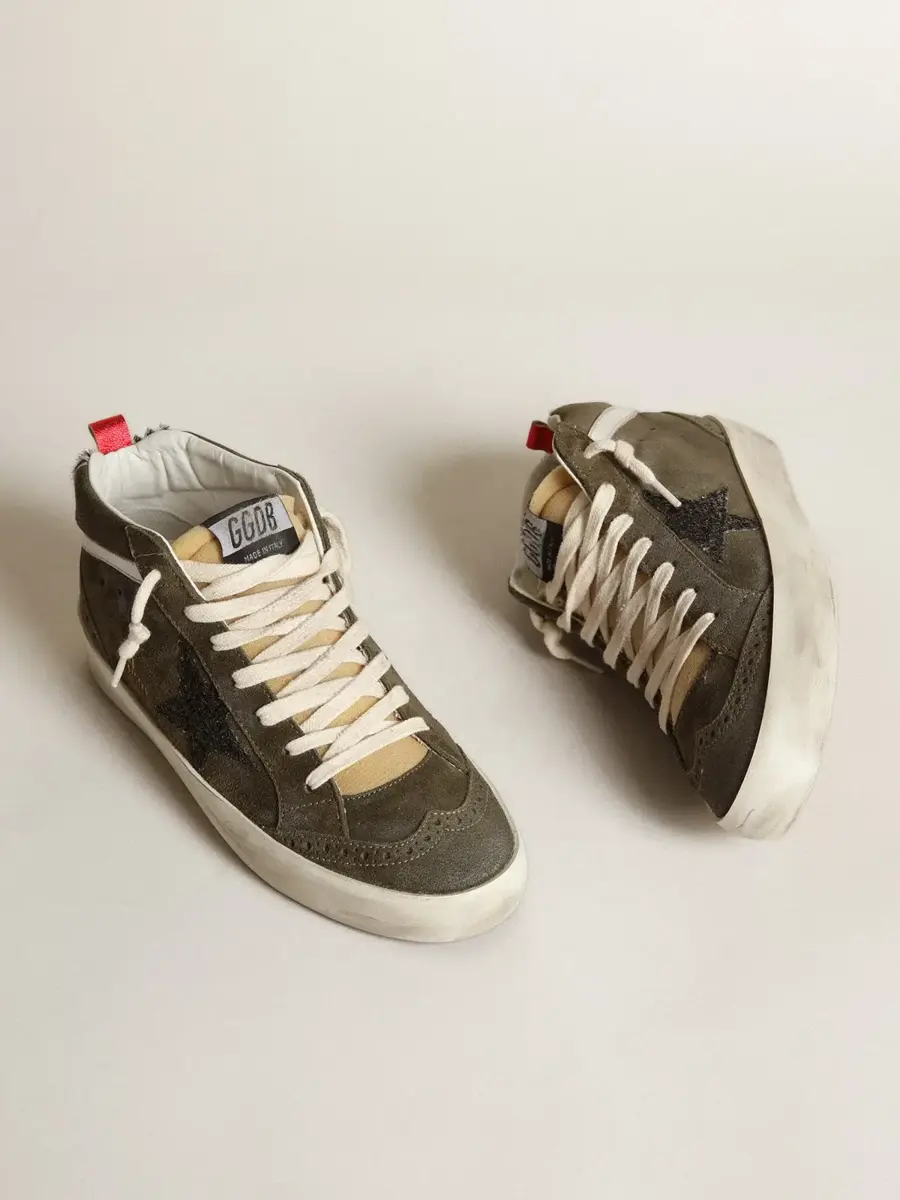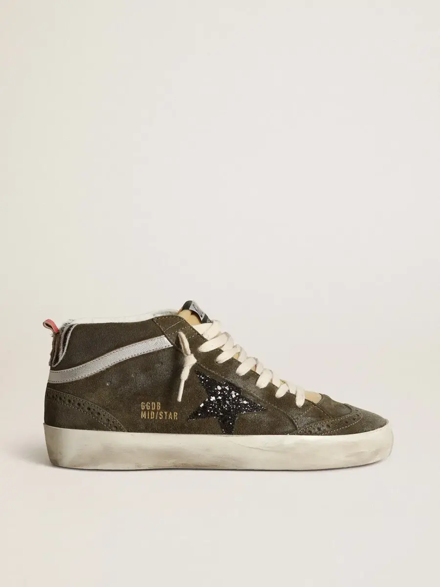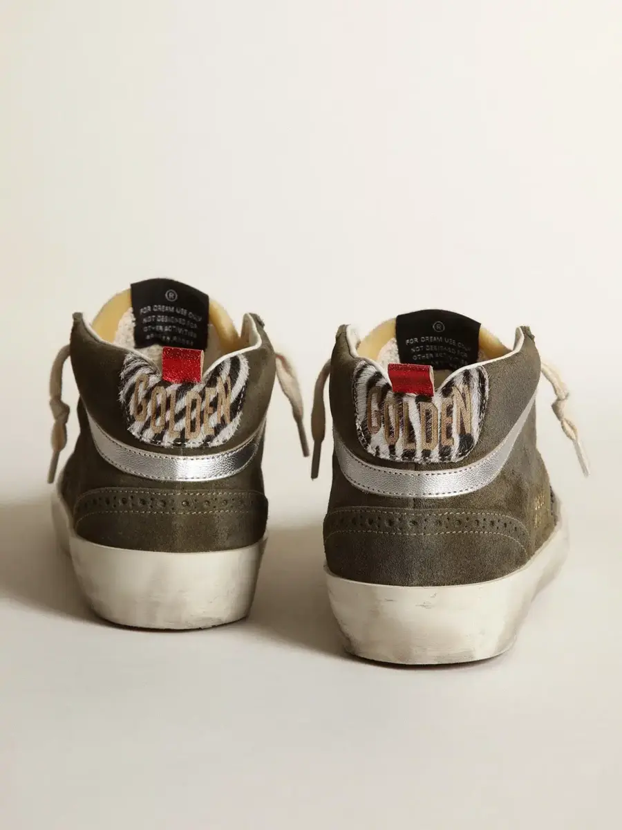 Versatilidad única y elegante: las zapatillas Mid Star adoptan un enfoque refinado de su inspiración en la escena del skate de los noventa. Este modelo para mujer, con una parte superior de ante verde oliva, cuenta con una estrella negra brillante y una lengüeta en el talón de piel de potro con estampado de cebra en blanco y negro. Una lengüeta de TPU y cordones de color crema completan el look.