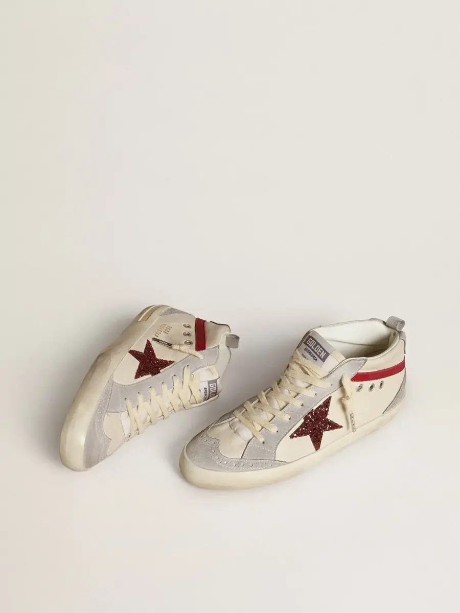 Versatilidad única y elegante: las zapatillas Mid Star adoptan un enfoque refinado de su inspiración en la escena del skate de los noventa. Con una parte superior de cuero blanco acentuada por inserciones de ante gris, este modelo presenta una estrella brillante burdeos y un detalle de nubuck rojo. La lengüeta de ante gris, la lengüeta de nailon blanco y los cordones de color crema completan el look.