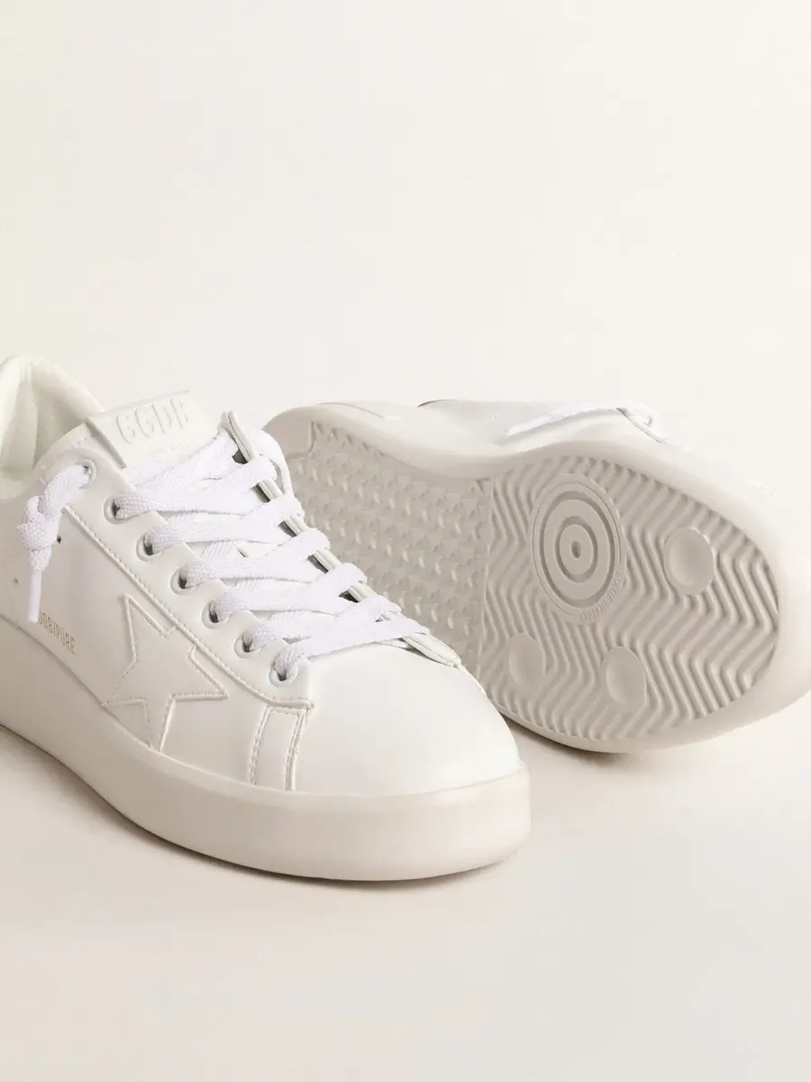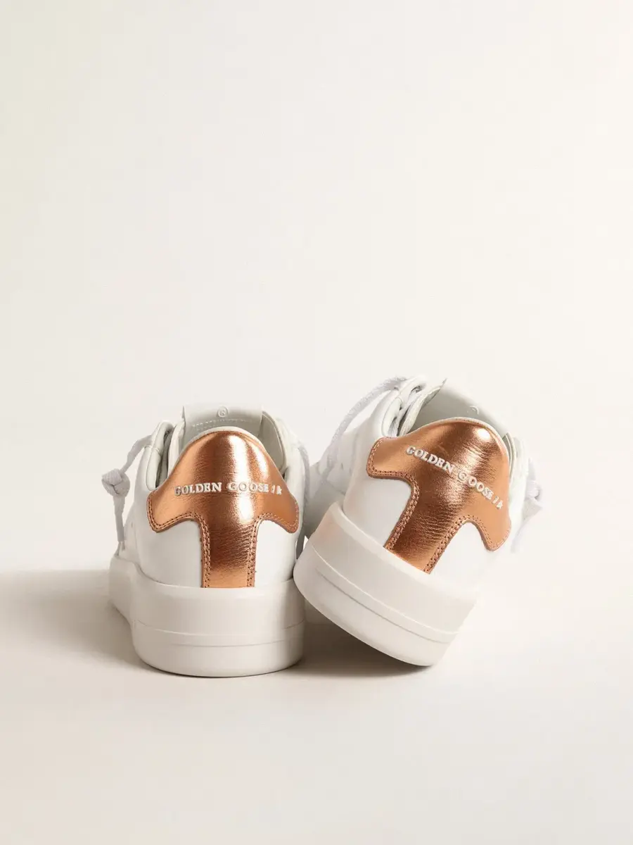 Cuando el minimalismo de la forma se une a la fuerza de los detalles: nuestras zapatillas Purestar combinan un estilo discreto con una comodidad extrema gracias a su tecnología de absorción de impactos. Este modelo para mujer, con una parte superior blanca de origen biológico, presenta una estrella tono sobre tono y una lengüeta en el talón de cuero metalizado en color bronce. Los cordones blancos completan el look.