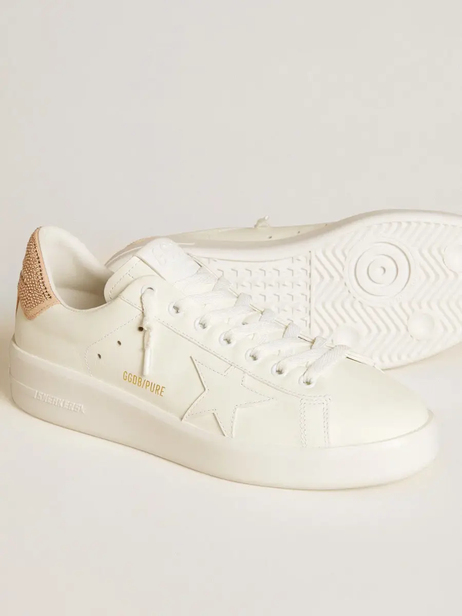Cuando el minimalismo de la forma se une a la fuerza de los detalles: nuestras zapatillas Purestar combinan un estilo discreto con una comodidad extrema gracias a su tecnología de absorción de impactos. Confeccionado en piel blanca, este modelo cuenta con una estrella de piel blanca y una lengüeta de ante rosa melocotón en el talón, resaltada con cristales Swarovski tono sobre tono. Los cordones blancos completan el look.