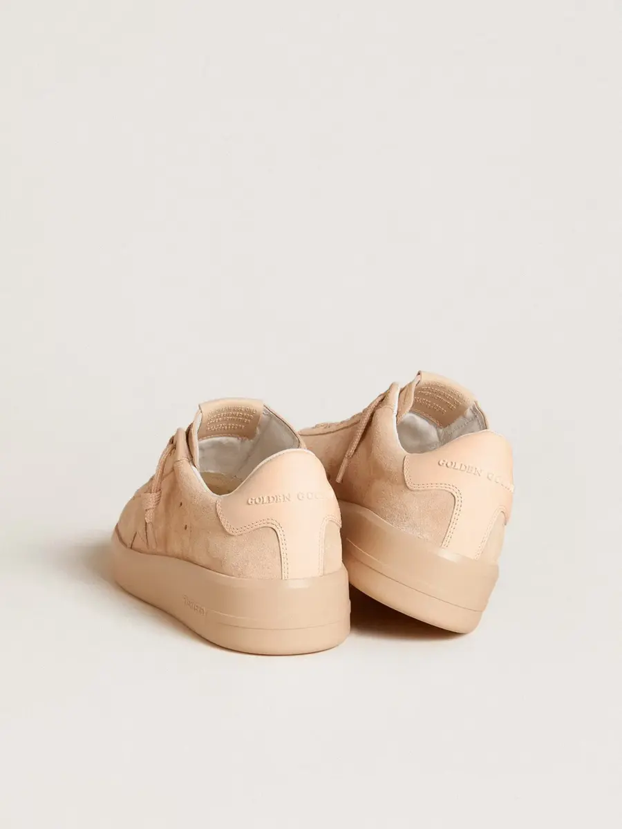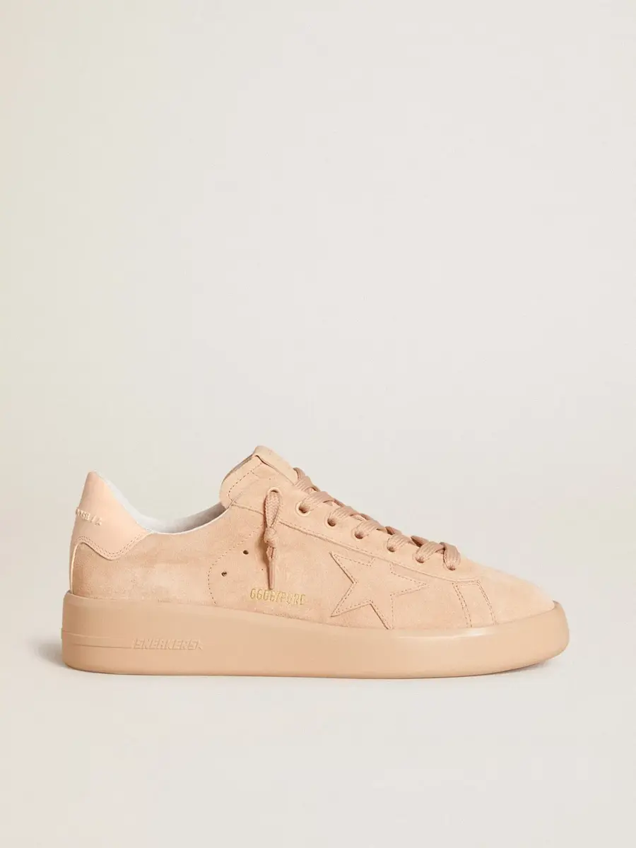 Cuando el minimalismo de la forma se une a la fuerza de los detalles: nuestras zapatillas Purestar combinan un estilo discreto con una comodidad extrema gracias a su tecnología de absorción de impactos. Este modelo de ante rosa claro presenta detalles tono sobre tono, como una estrella de ante y una lengüeta de cuero en el talón. Los cordones rosa claro completan el look.