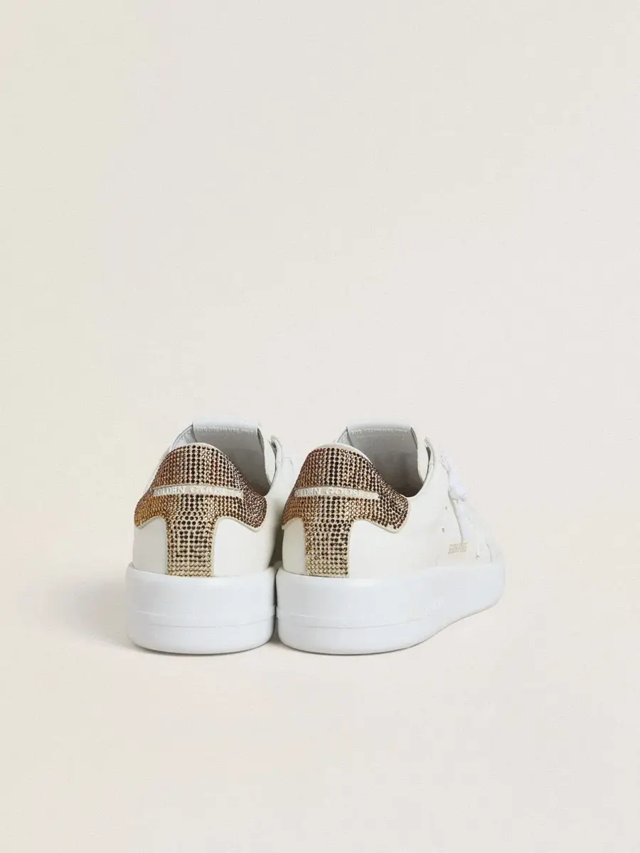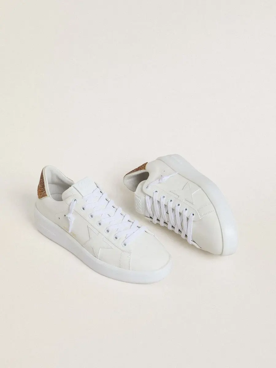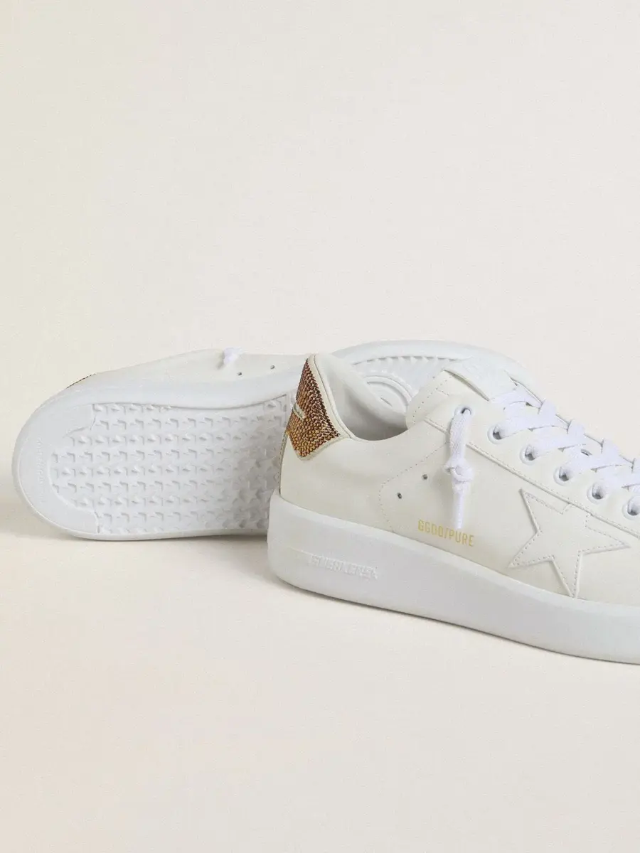 Cuando el minimalismo de la forma se une a la fuerza de los detalles: nuestras zapatillas Purestar combinan un estilo discreto con una comodidad extrema gracias a su tecnología de absorción de impactos. Este modelo de piel blanca para mujer cuenta con una estrella de piel blanca y una lengüeta marrón con cristales en el talón. Los cordones blancos completan el look.