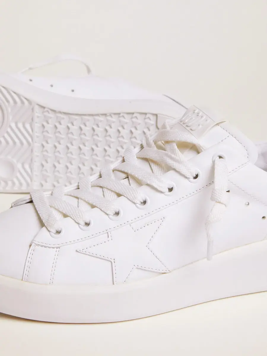 Cuando el minimalismo de la forma se une a la fuerza de los detalles: nuestras zapatillas Purestar combinan un estilo discreto con una comodidad extrema gracias a su tecnología de absorción de impactos. Este modelo de piel blanca presenta una estrella de piel tono sobre tono y una lengüeta plateada con microbrillo en el talón. Los cordones blancos completan el look.