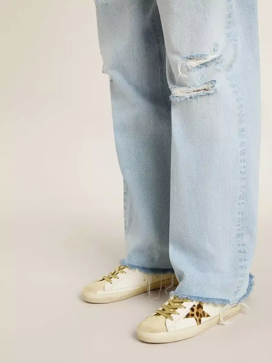 La versión sabo de nuestras icónicas zapatillas: con una parte superior de piel blanca, estas Super-Star cuentan con la clásica estrella de piel de potro en beige y estampado de leopardo marrón. La lengüeta de ante beige y los cordones dorados de Lurex completan el look.
