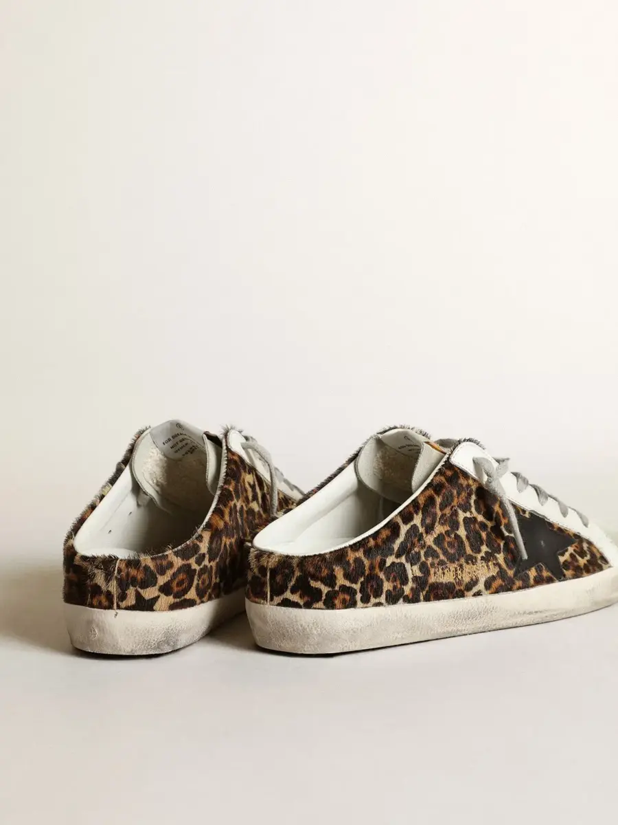 Nuestras icónicas zapatillas deportivas en la nueva versión sabot: este modelo Super-Star presenta una parte superior de piel de potro con estampado de leopardo en beige y marrón, acentuada con una estrella de cuero negro y una lengüeta de ante gris hielo. La inserción de cuero blanco y los cordones gris hielo completan el look.