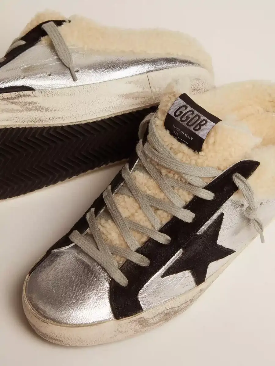 Nuestras icónicas zapatillas en la nueva versión sabot: forradas con suave piel de oveja, estas zapatillas Super-Star cuentan con una parte superior de piel laminada plateada adornada con una estrella de ante negro e inserciones. La lengüeta de borreguillo beige y los cordones gris hielo completan el look.