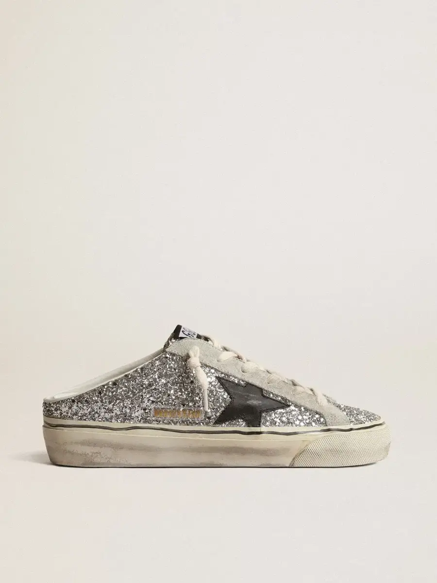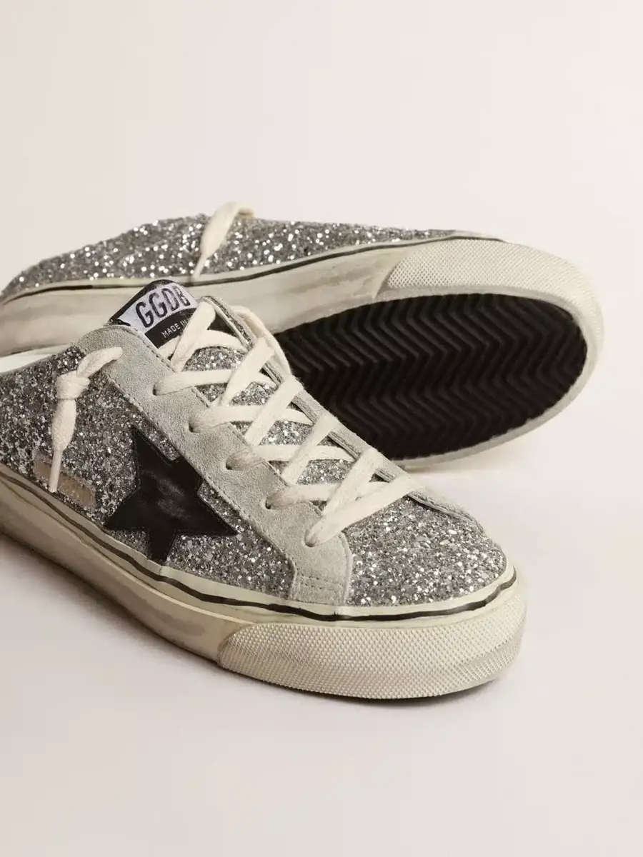 Super-Star Sabot para mujer en plata brillante con estrella de cuero negro