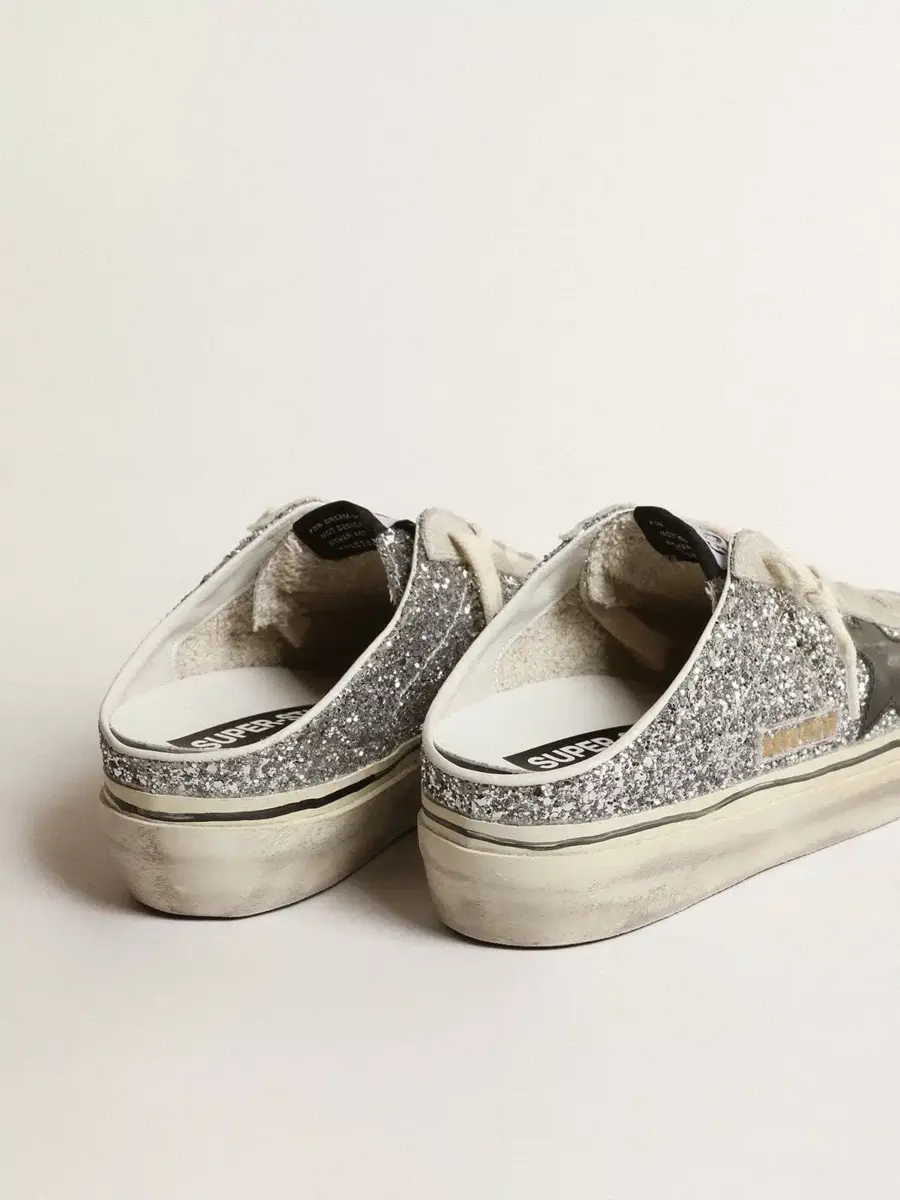 Nuestras icónicas zapatillas en versión sabot: estas Super-Star para mujer presentan una parte superior plateada brillante acentuada por inserciones de ante gris claro. La estrella de cuero negro y los cordones blanco lechoso completan el look.