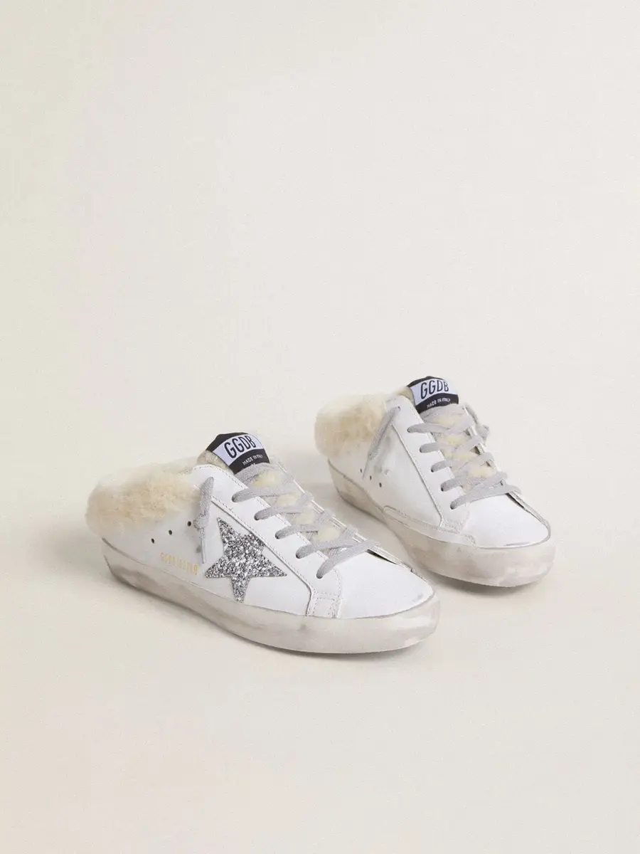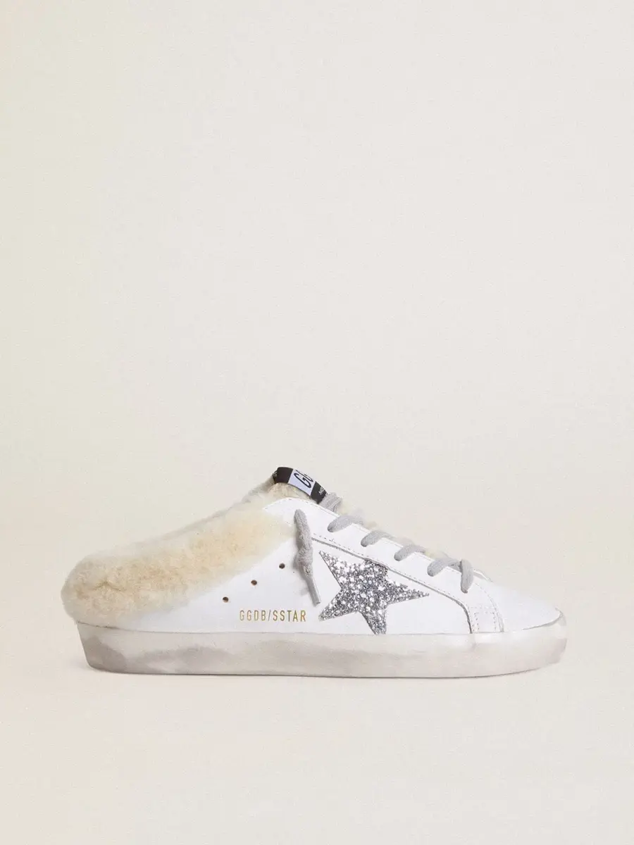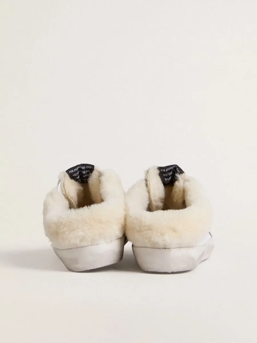 Super-Star Sabots en piel blanca con forro de borreguillo y estrella plateada