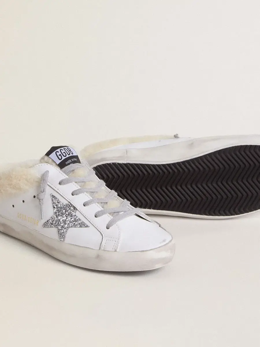Nuestras icónicas zapatillas en la nueva versión sabot: estas zapatillas Super-Star cuentan con la clásica parte superior en piel blanca y un suave forro de borreguillo. La estrella de microcristales plateados completa el look.