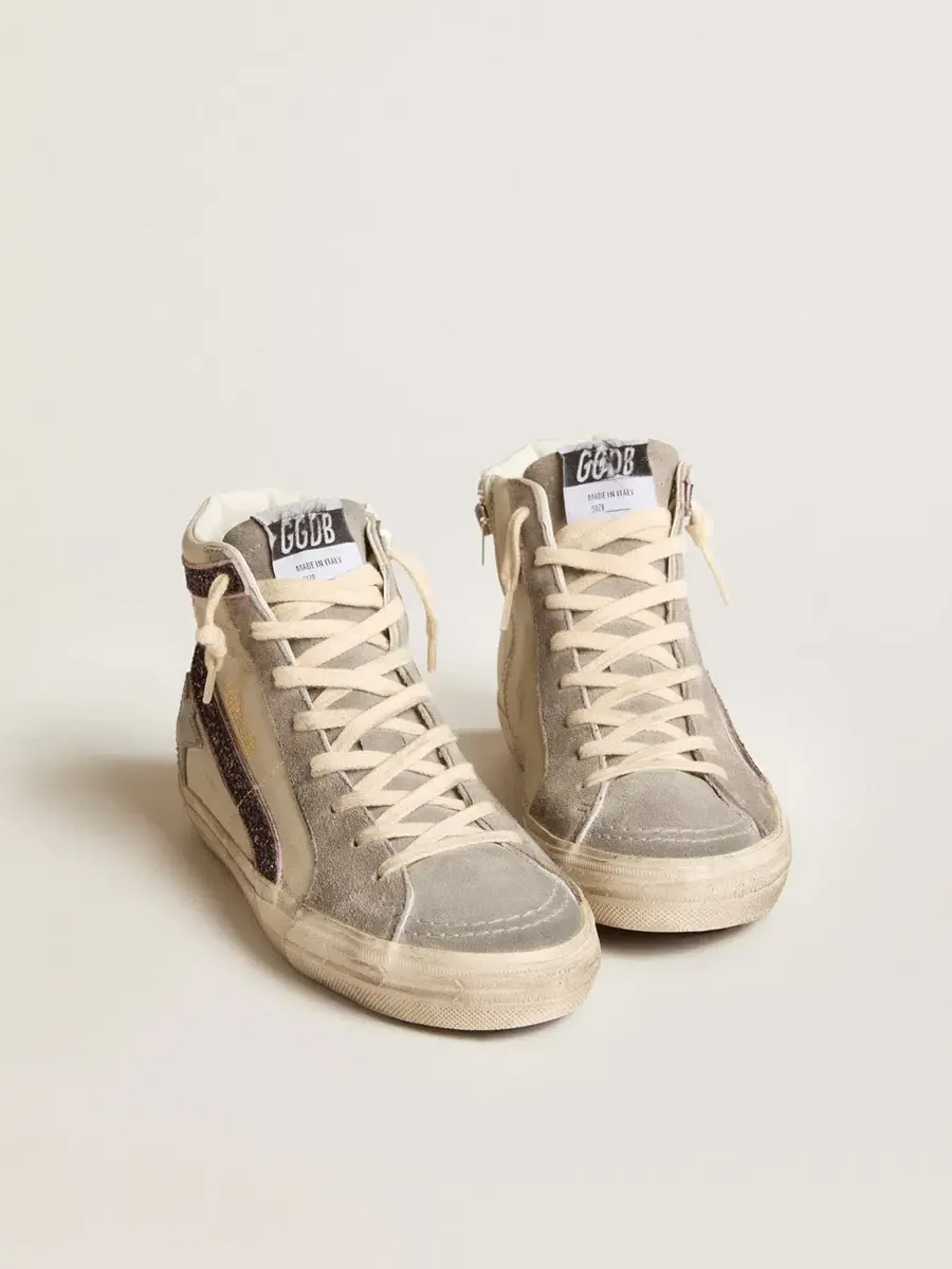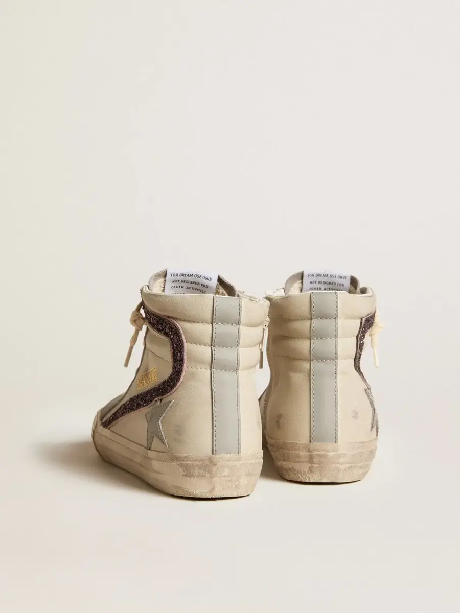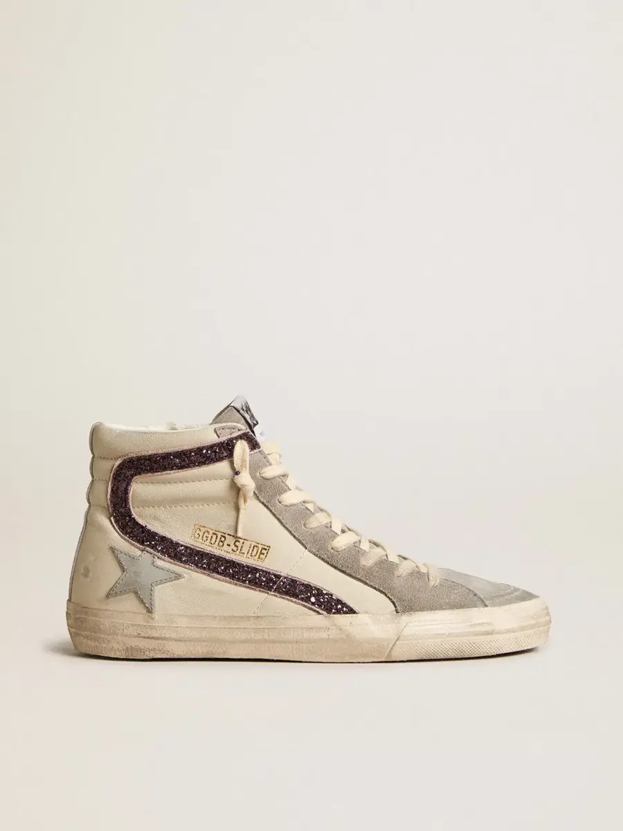 Alma skater, actitud glamurosa. Nuestras zapatillas Slide te transportan directamente a Venice Beach, entre un ollie y un kickflip. Este modelo con parte superior de piel blanca cuenta con una estrella de piel gris e inserciones de ante gris hielo y gris paloma, incluyendo la lengüeta y los ojales. El destello rojo vino con ribete de ante rosa, la lengüeta del talón de cuero gris y los cordones blancos completan el look.