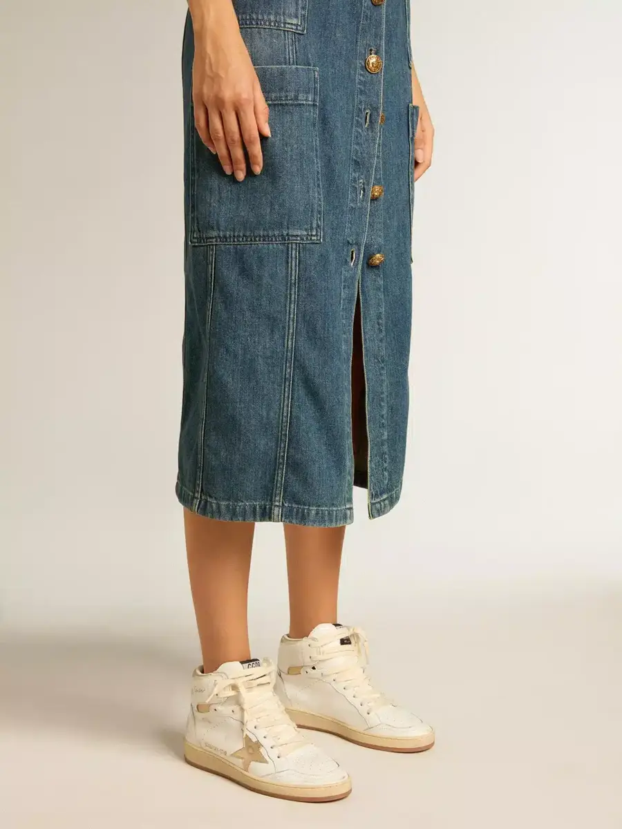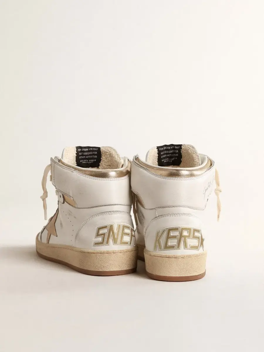 Una reinterpretación de las zapatillas altas con alma auténtica: inspiradas en nuestro modelo Ball Star, nuestras zapatillas Sky-Star tienen un aire universitario americano y evocan el ambiente del baloncesto de los años ochenta. Este modelo, con parte superior de piel napa blanca, cuenta con una estrella y una lengüeta en el talón de piel metalizada dorada, y la firma Golden Goose en la parte superior del tobillo, una referencia al sueño infantil de que tus zapatillas favoritas las firmen las leyendas del baloncesto. Los cordones de color crema completan el look.