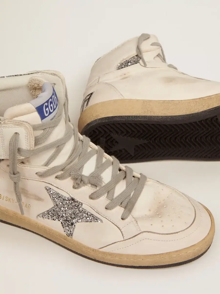 Una reinterpretación de las zapatillas altas con un alma auténtica: inspiradas en nuestro modelo Ball Star, nuestras zapatillas Sky-Star tienen un aire universitario americano y recuerdan al baloncesto de los años ochenta. Confeccionadas en piel napa blanca con inserciones plateadas brillantes, llevan la firma Golden Goose en el cuello del tobillo, una referencia al sueño infantil de que tus zapatillas favoritas las firmen las leyendas del baloncesto.