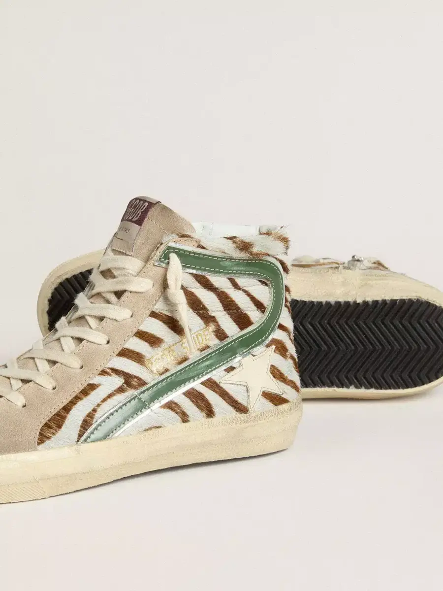 Alma skater, actitud glamurosa. Nuestras zapatillas Slide te transportan directamente a Venice Beach, entre un ollie y un kickflip. Con una parte superior de piel de potro con estampado de cebra y inserciones de ante beige, este modelo cuenta con una estrella de cuero blanco y una lengüeta en el talón de ante beige. El detalle de cuero laminado verde y los cordones blancos completan el look.
