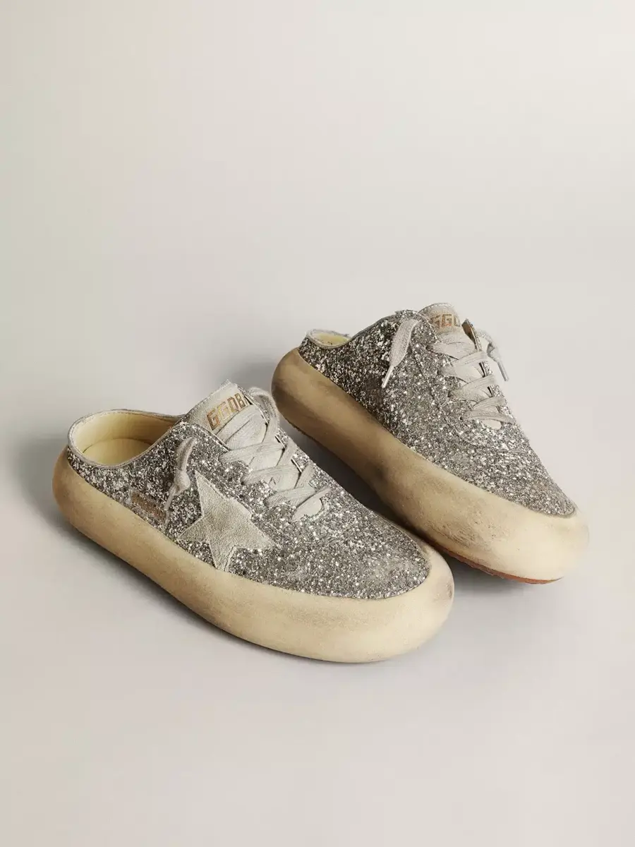 Tu nuevo momento para desconectar de la realidad y volar como nunca antes. Envuelta en esa increíble sensación de ligereza desde el primer segundo, dejando espacio para la versión más audaz de ti misma. Por fin liberas tu estilo y vacías tu mente. Los zapatos Space-Star cuentan con una suela extra acolchada y una plantilla rellena de espuma viscoelástica, lo que garantiza una comodidad sin igual desde el primer paso. Esta versión sabot con parte superior plateada brillante se caracteriza por su estrella y lengüeta de ante gris hielo. El forro de piel suave y los cordones gris hielo completan el look.