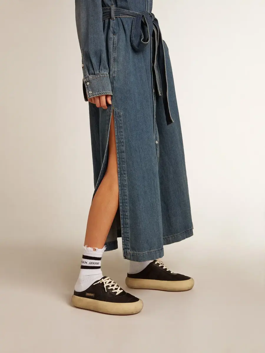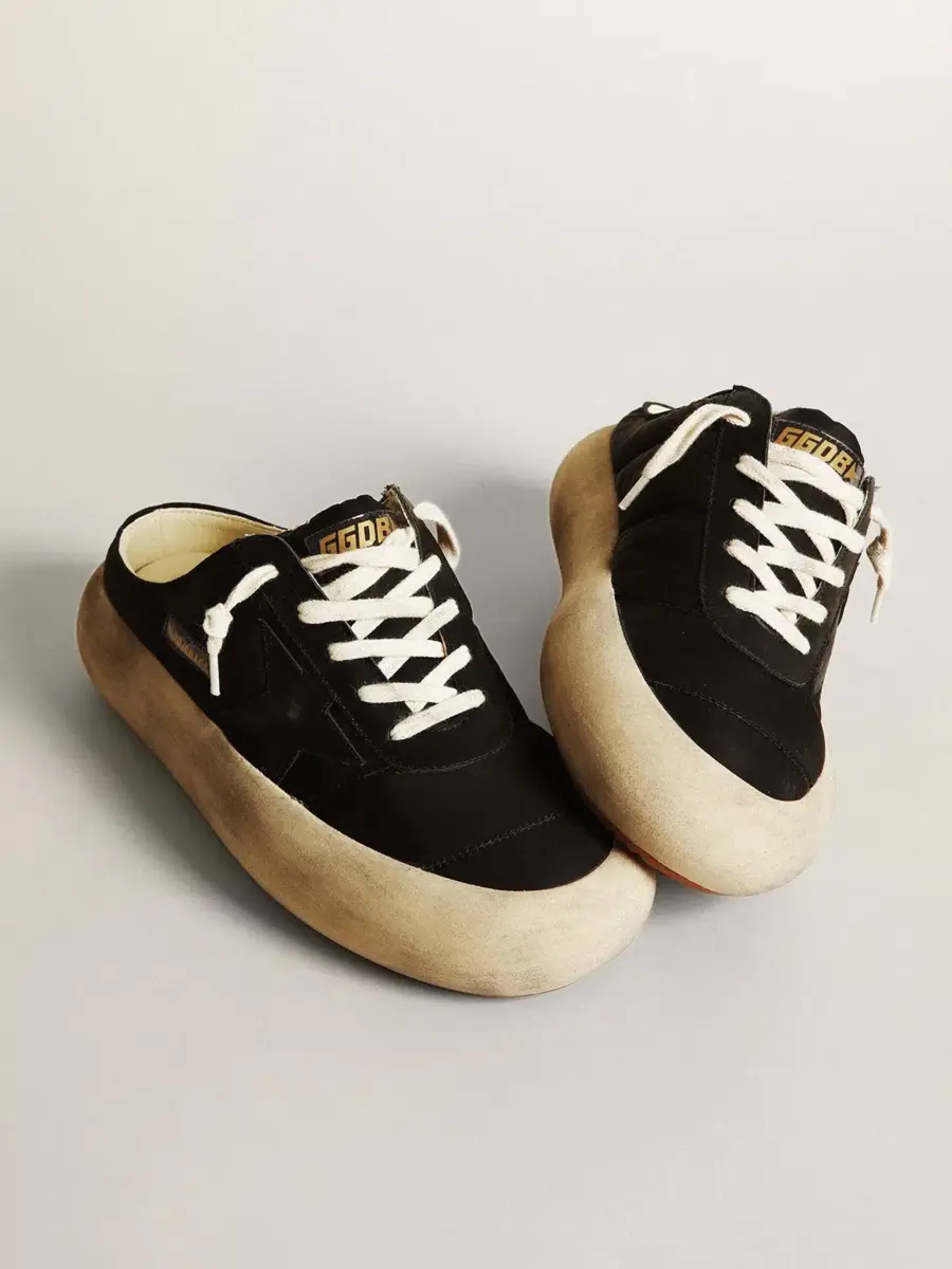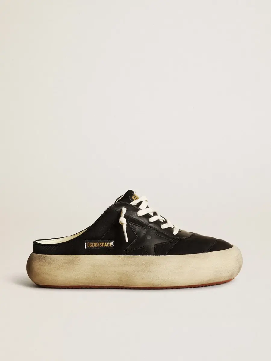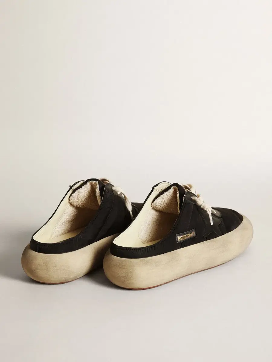 Tu nuevo momento para desconectar de la realidad y volar como nunca antes. Envuelta en esa increíble sensación de ligereza desde el primer segundo, dejando espacio para la versión más audaz de ti misma. Por fin liberas tu estilo y vacías tu mente. Los zapatos Space-Star cuentan con una suela extra acolchada y una plantilla rellena de espuma viscoelástica, lo que garantiza una comodidad sin igual desde el primer paso. Esta versión de sabots para mujer presenta una parte superior de nailon negro acentuada con inserciones de cuero negro, incluida la estrella, y un forro de cuero suave. Los cordones de color crema completan el look.