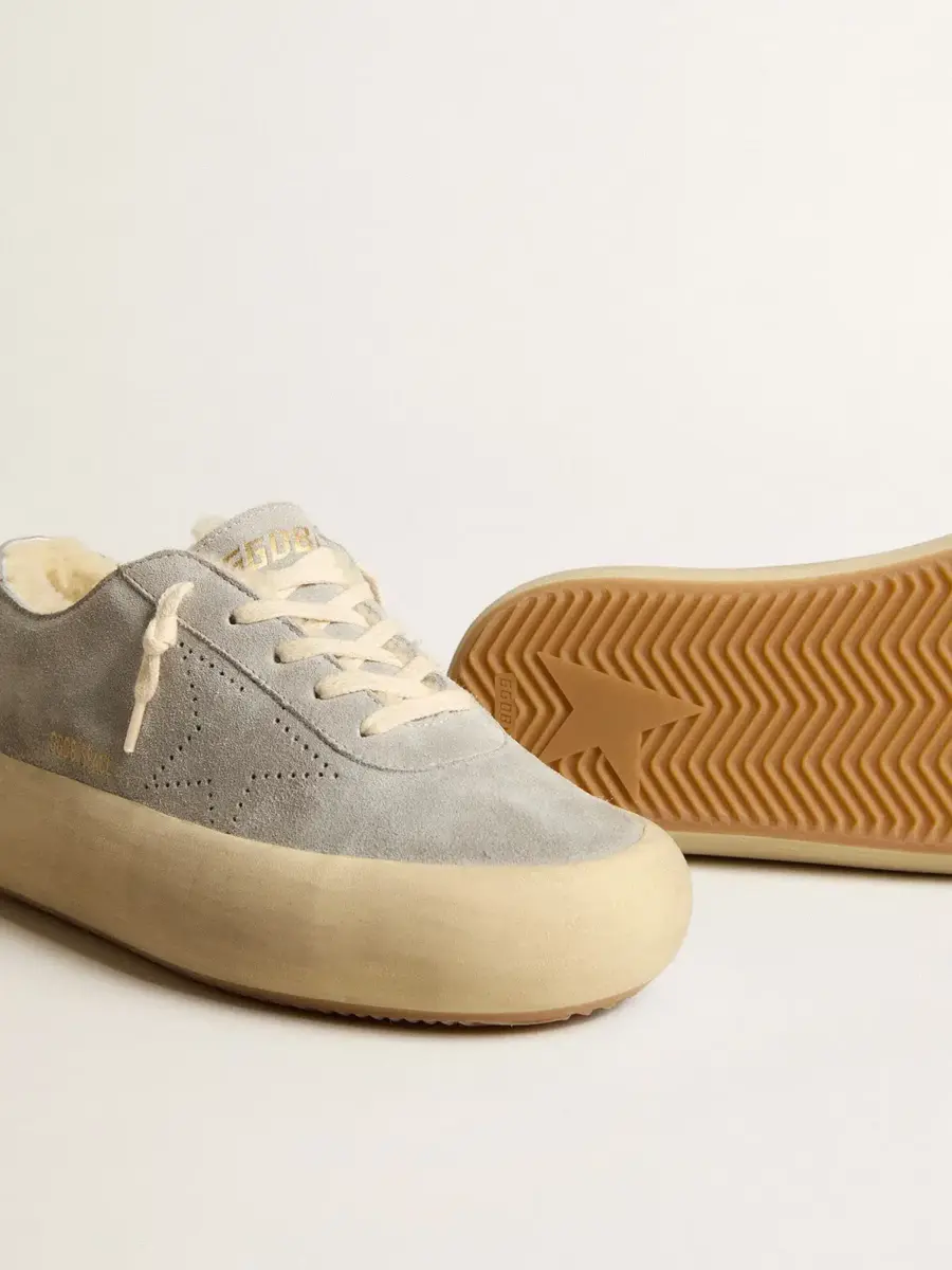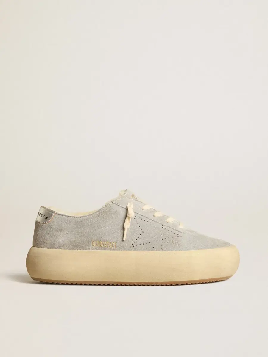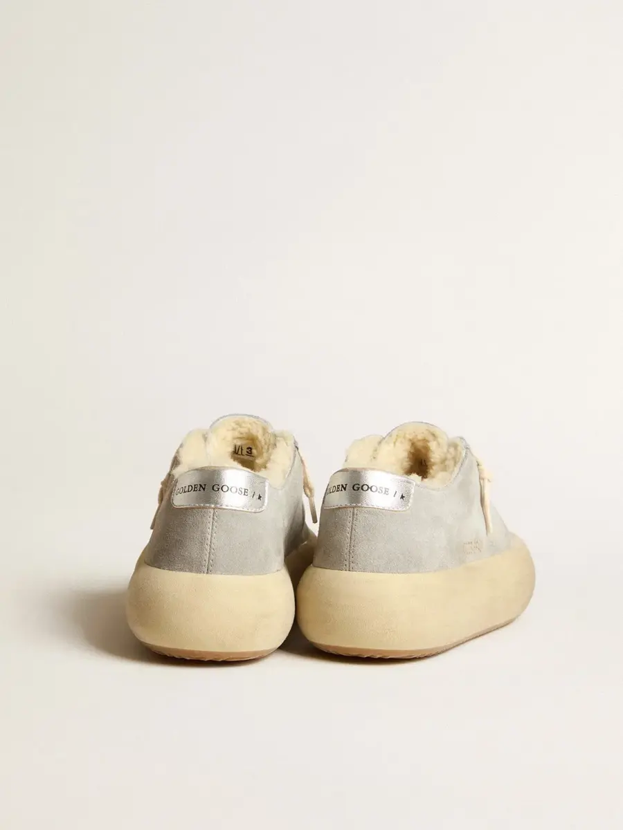 Tu nuevo momento para desconectar de la realidad y encontrar tu centro. Tu nueva forma de volver a ti misma y respirar tu propia ligereza, volando como nunca antes. Las cómodas zapatillas Space cuentan con una suela extra acolchada y una plantilla rellena de espuma viscoelástica, lo que garantiza una comodidad sin igual desde el primer paso. Este modelo para mujer, forrado en suave piel de oveja beige, presenta una parte superior de ante gris hielo acentuada con una estrella perforada tono sobre tono y una lengüeta en el talón de cuero metalizado plateado. Los cordones de color crema completan el look.