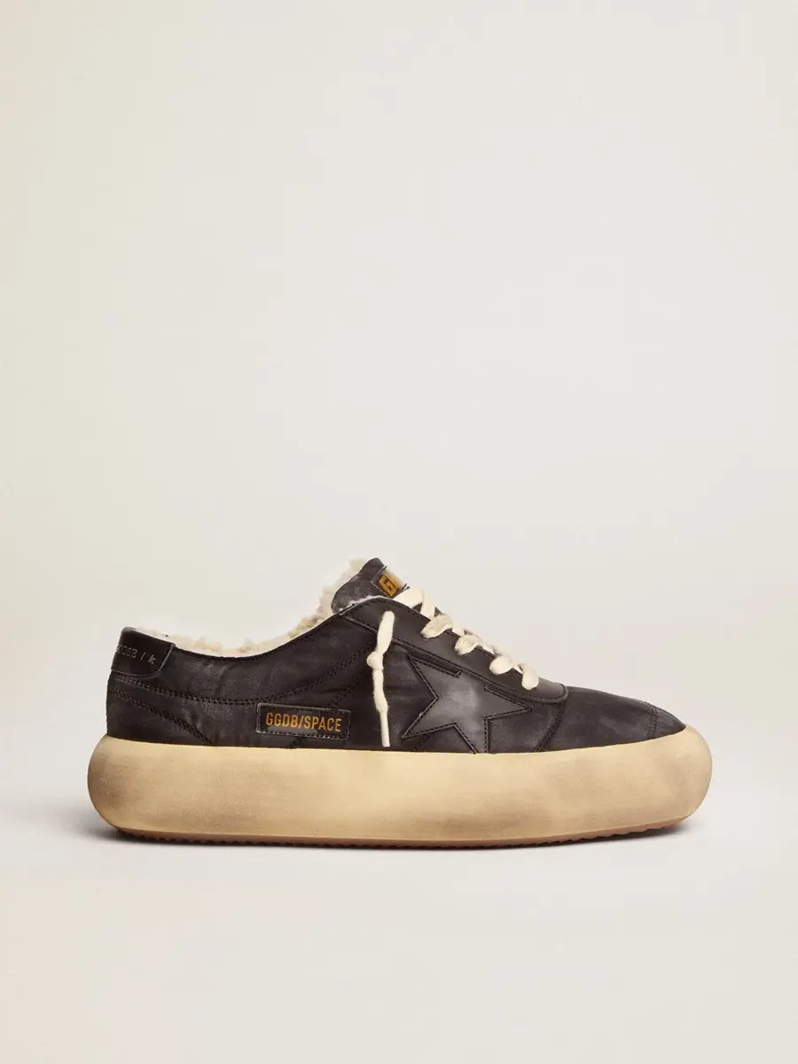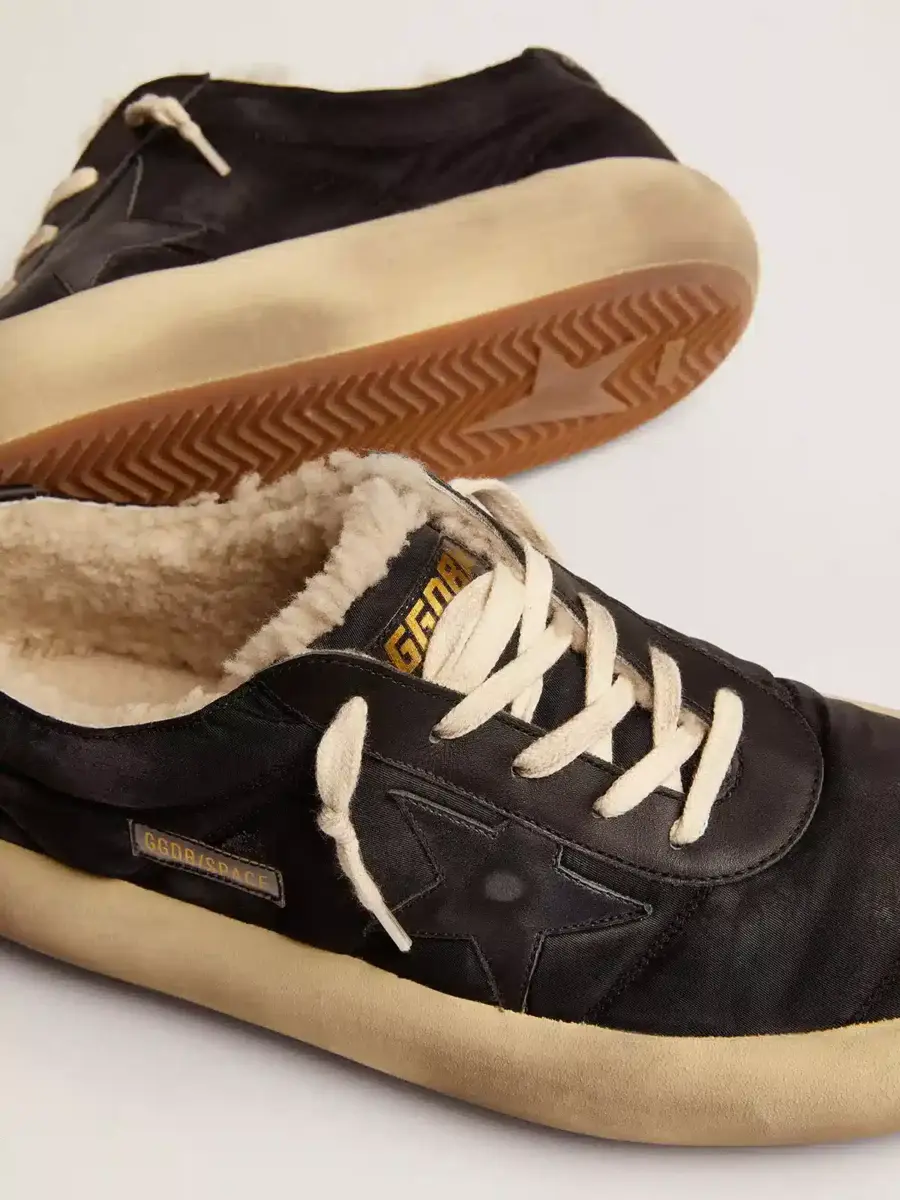 Tu nuevo momento para desconectar de la realidad y volar como nunca antes. Envuelto en esa increíble sensación de ligereza desde el primer segundo, dejando espacio para la versión más audaz de ti mismo. Por fin liberas tu estilo y vacías tu mente. Las zapatillas Space-Star cuentan con una suela extra acolchada y una plantilla rellena de espuma viscoelástica, lo que garantiza una comodidad sin igual desde el primer paso. En nailon negro acolchado, esta versión para mujer destaca por su estrella aplicada y su lengüeta de cuero negro en el talón, además de su suave forro de borreguillo. El acabado blanco encerado Lived-in completa el look.
