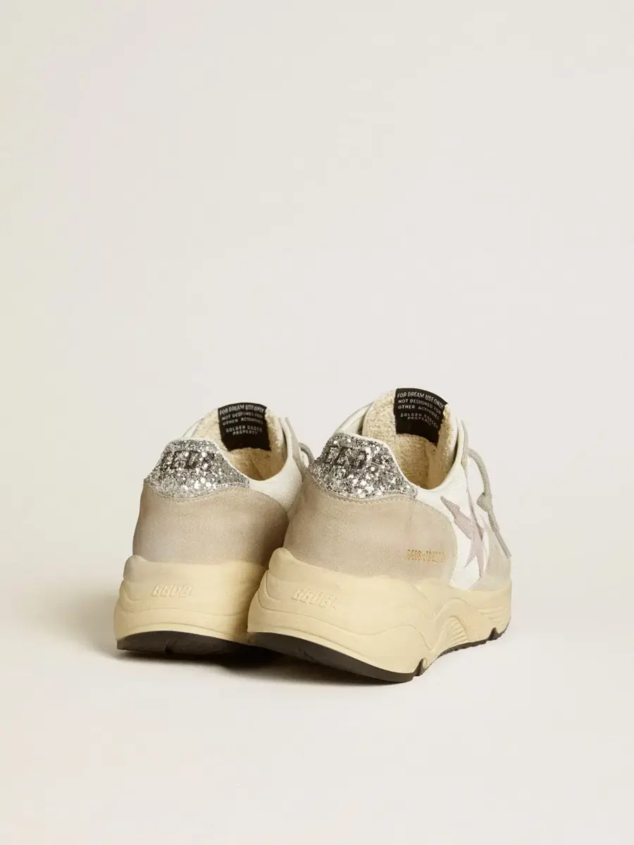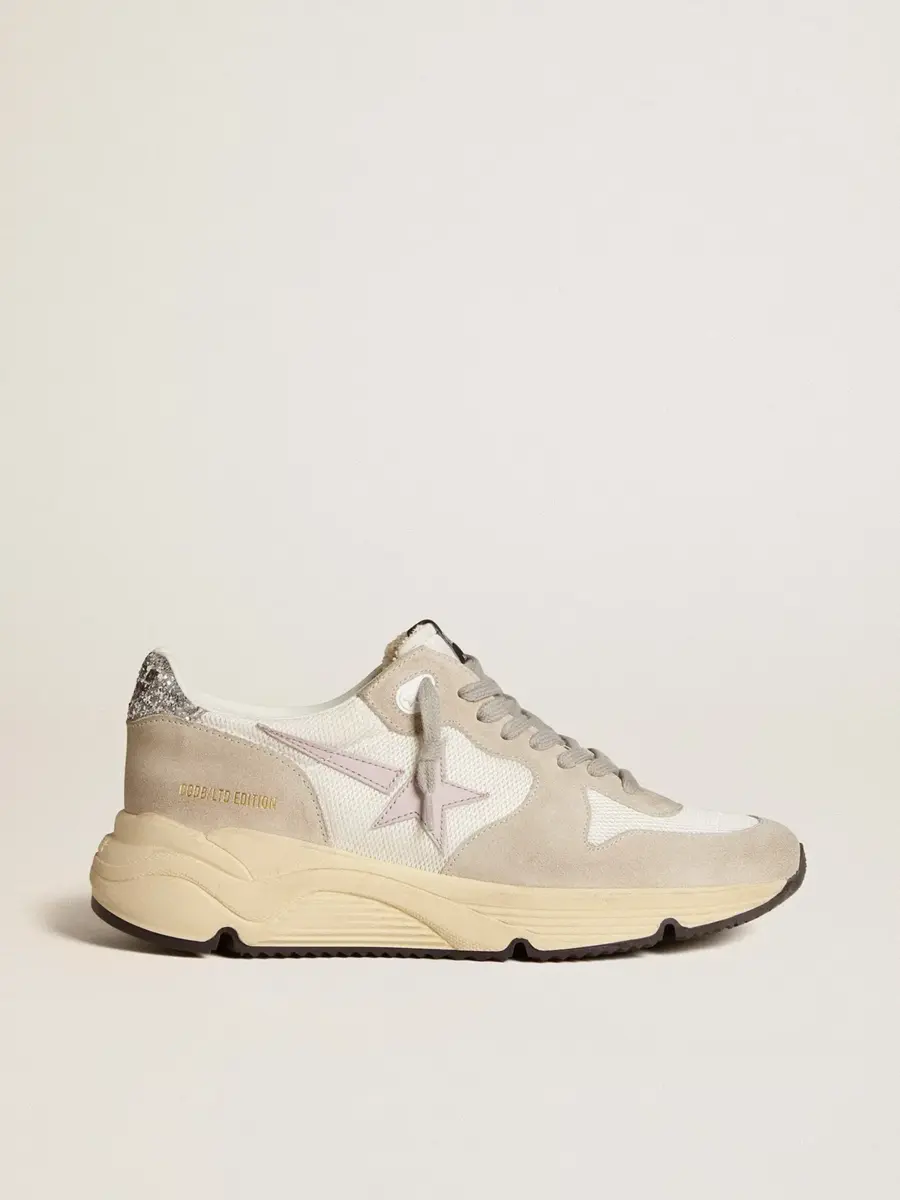 El estilo urbano y el espíritu artesanal se combinan en nuestras zapatillas Running Sole: la compañera ideal para tus aventuras metropolitanas. Este modelo, con una parte superior de malla blanca acentuada por inserciones de ante gris claro, cuenta con una estrella de cuero lila y una lengüeta plateada brillante en el talón. Los cordones gris hielo añaden el toque final.