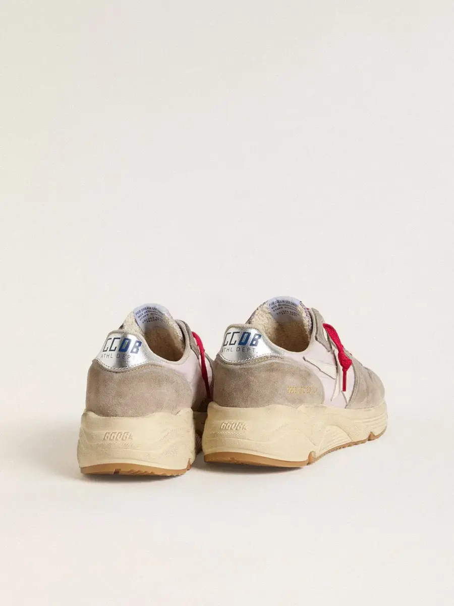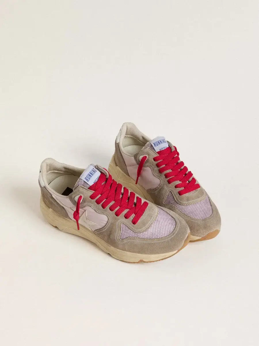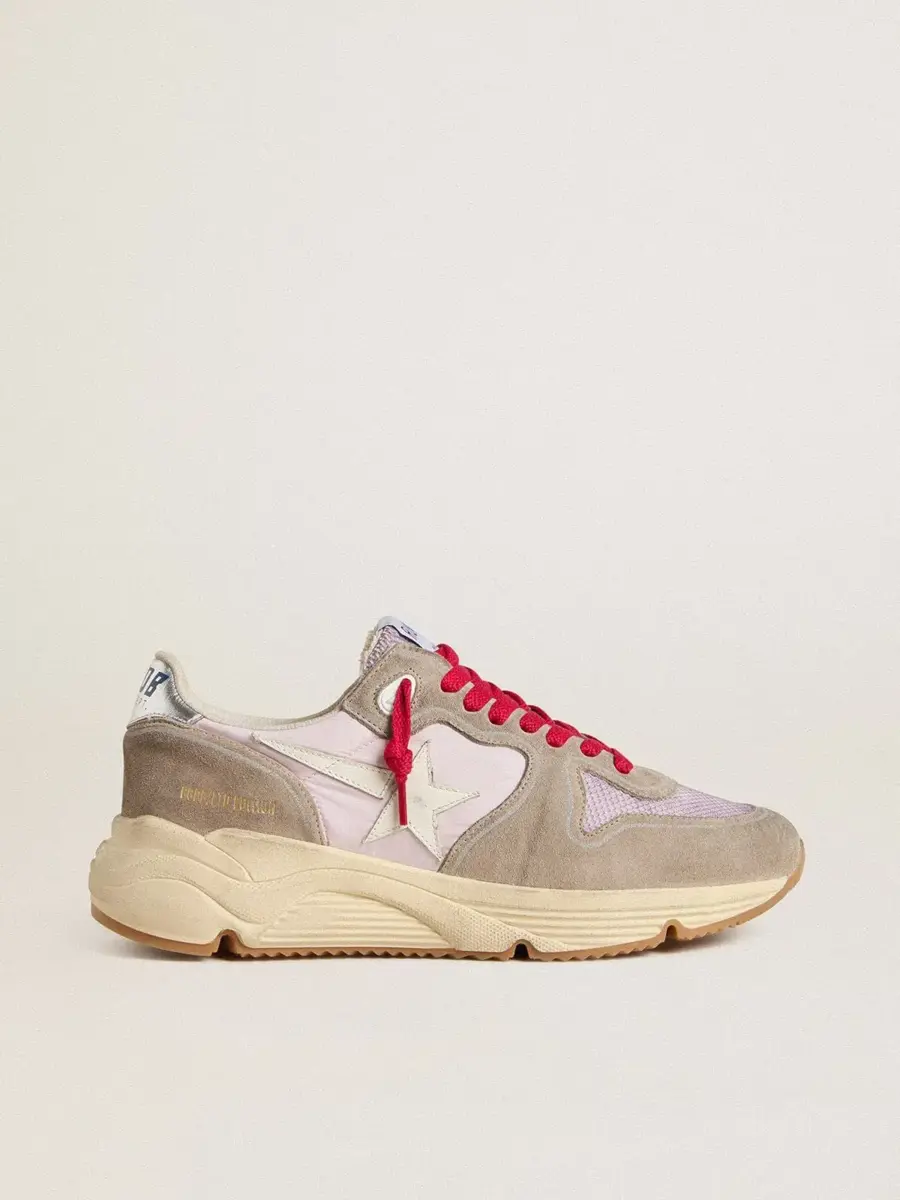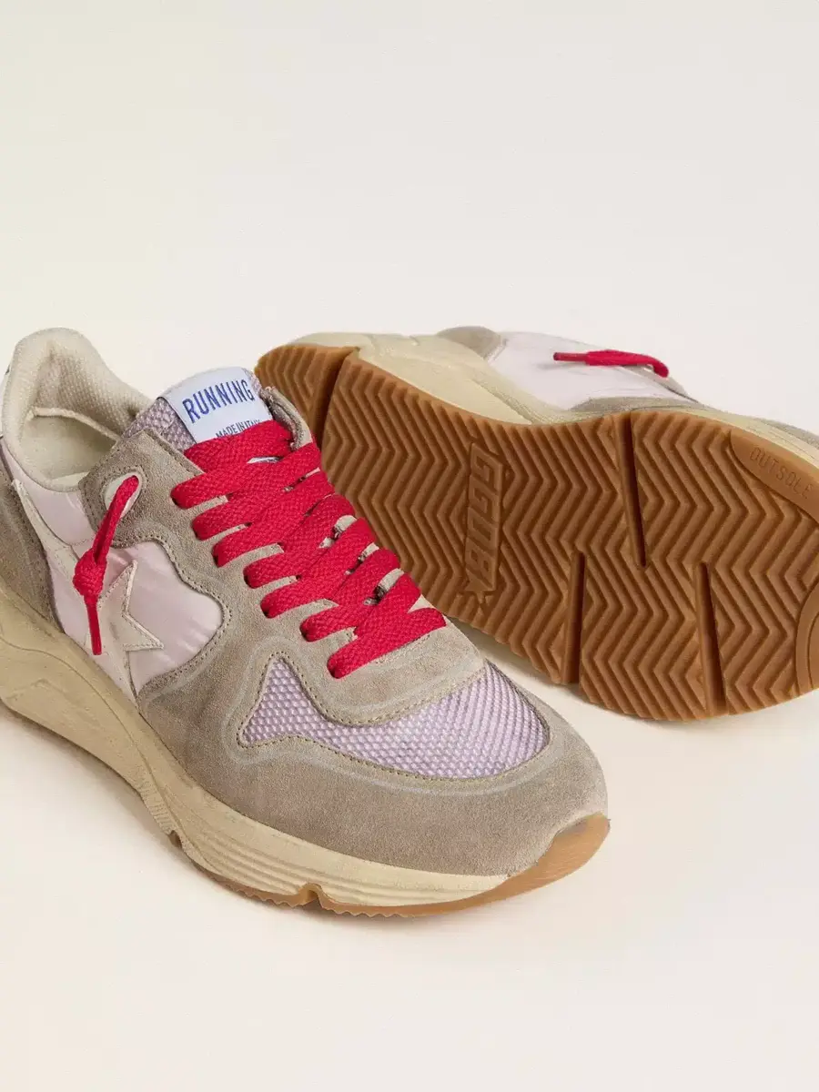El estilo urbano y el espíritu artesanal se combinan en nuestras zapatillas Running Sole: el compañero ideal para tus aventuras metropolitanas. Con una parte superior de nailon rosa acentuada con inserciones de ante beige, este modelo cuenta con una estrella de cuero blanco y una lengüeta de cuero plateado en el talón. La inserción de malla rosa y los cordones rojos añaden el toque final.