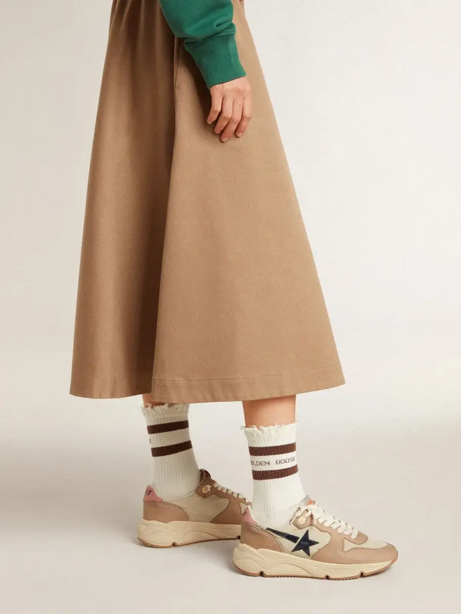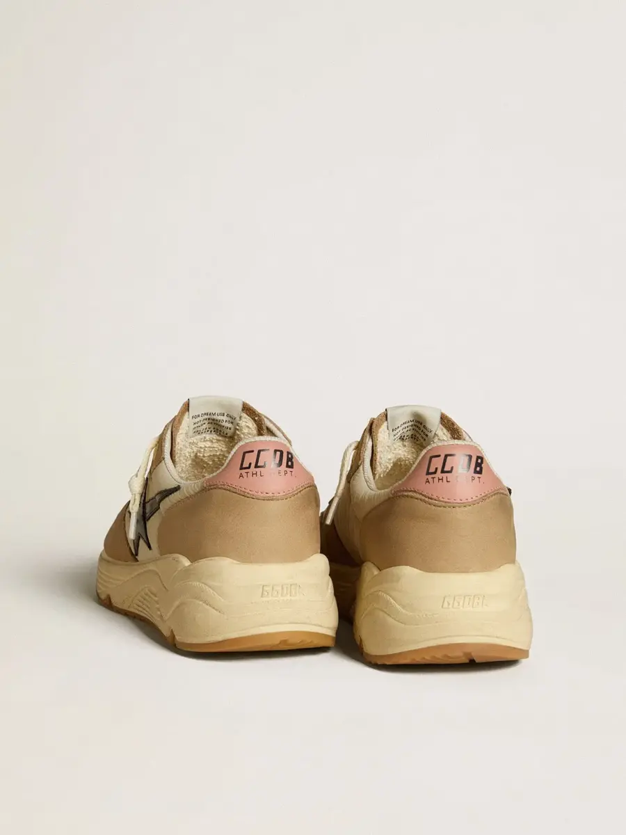 El estilo urbano y el espíritu artesanal se combinan en nuestras zapatillas Running Sole: el compañero ideal para tus aventuras metropolitanas. Este modelo presenta una parte superior de nailon color mármol y nubuck color arena, acentuada con una estrella de cuero azul medianoche y una lengüeta de cuero rosa en el talón. Los cordones blancos añaden el toque final.