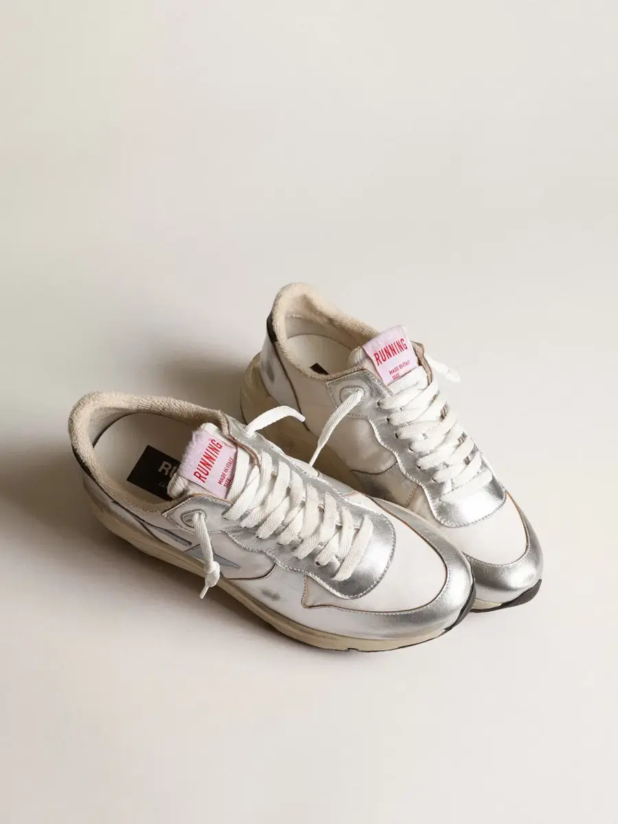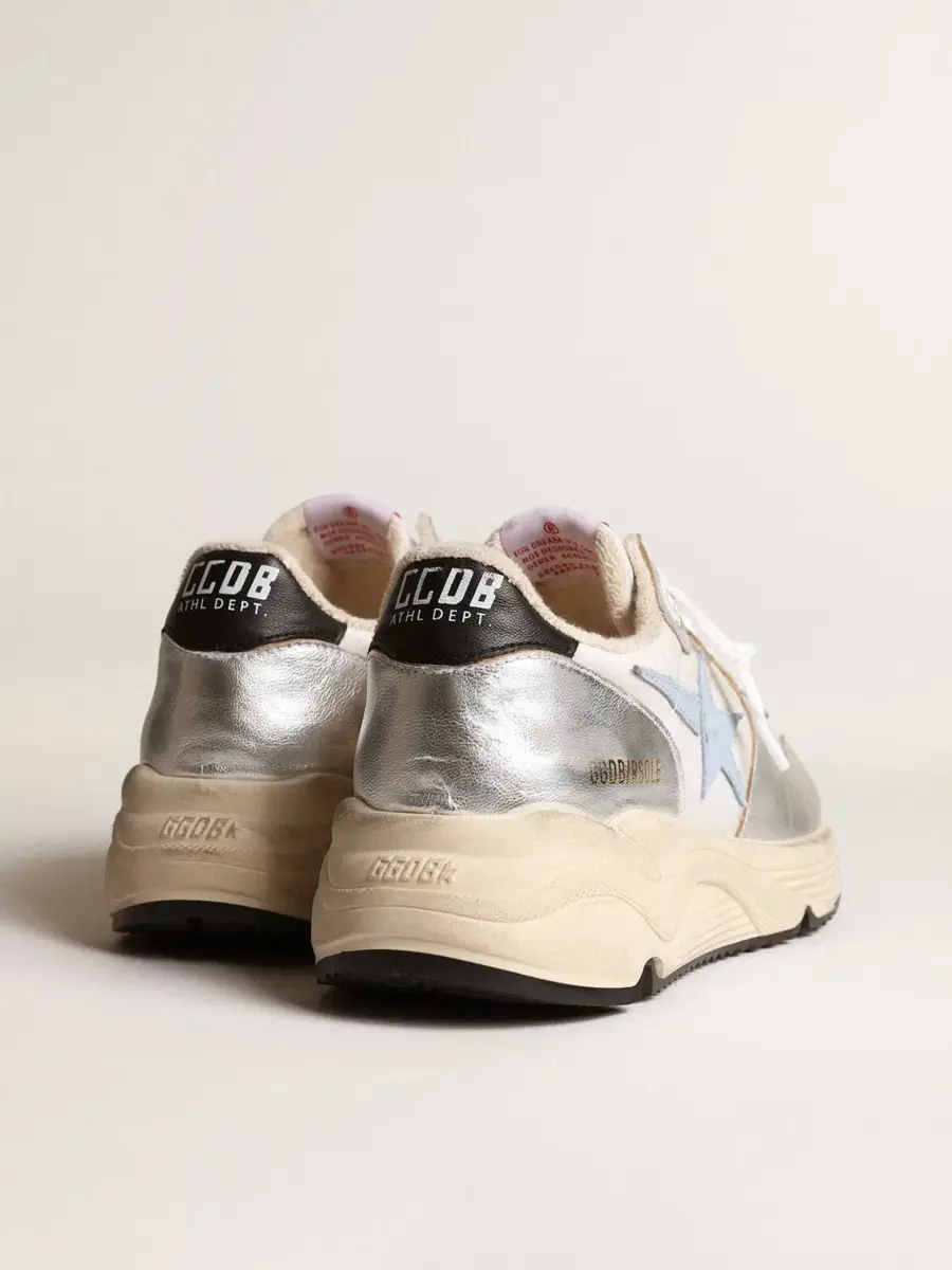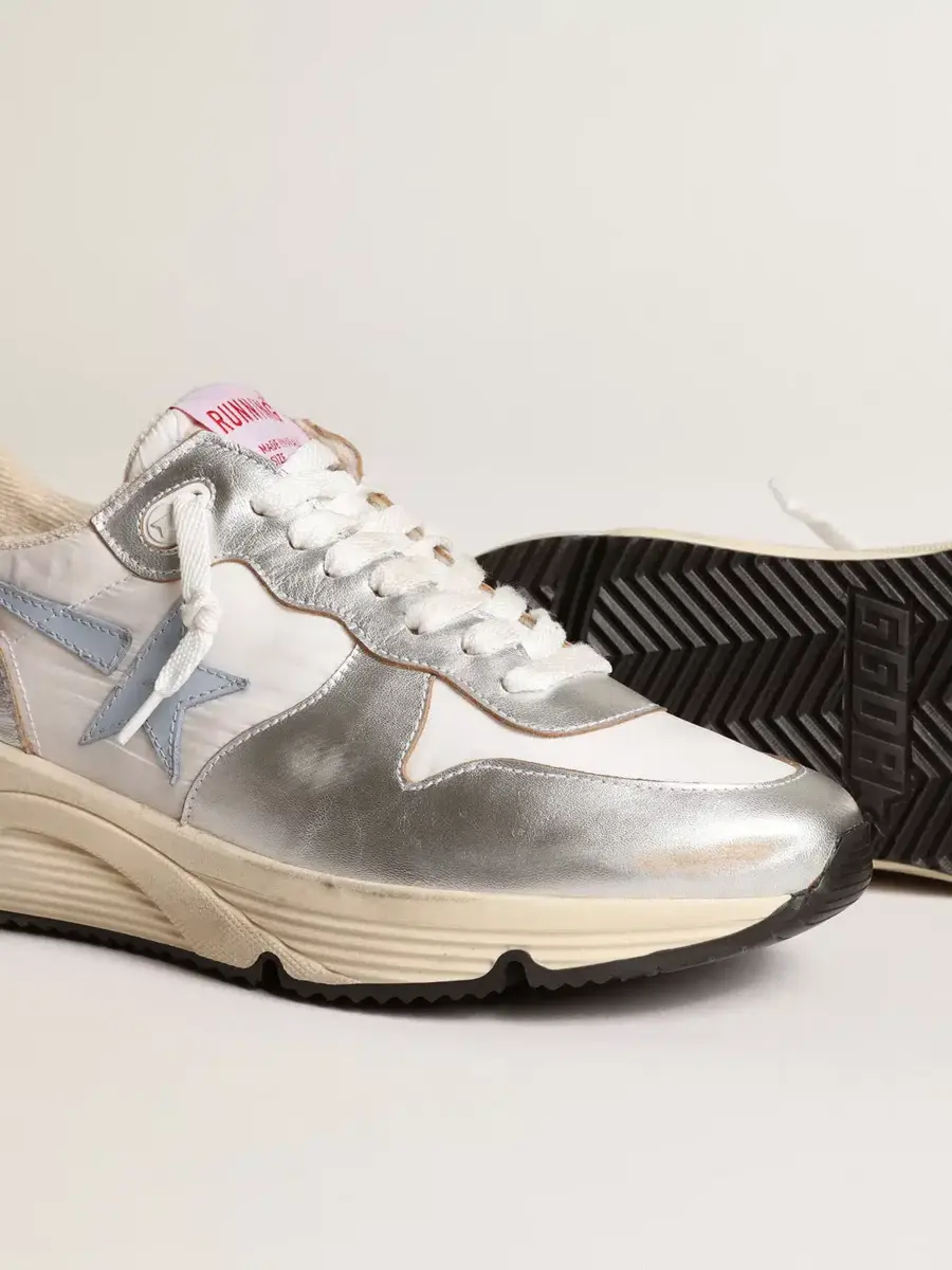 El estilo urbano y el espíritu artesanal se combinan en nuestras zapatillas Running Sole: el compañero ideal para tus aventuras metropolitanas. Este modelo con parte superior de nailon blanco realzada por inserciones de piel metalizada plateada cuenta con una estrella de piel azul claro ahumado y una lengüeta en el talón de piel napa negra. Los cordones blancos añaden el toque final.