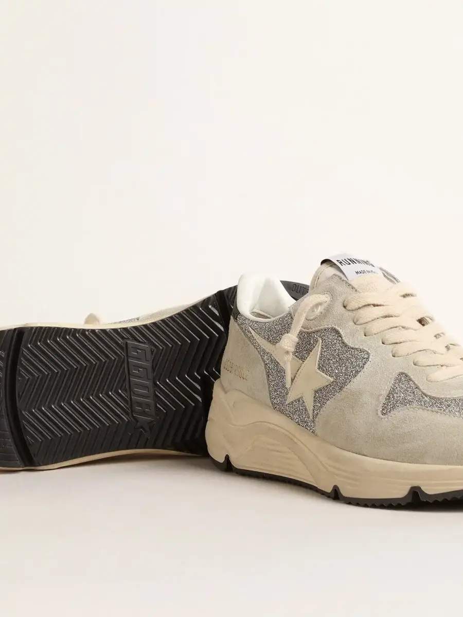 El estilo urbano y el espíritu artesanal se combinan en nuestras zapatillas Running Sole: la compañera ideal para tus aventuras metropolitanas. Este modelo presenta una parte superior en microcristales Swarovski plateados con inserciones de ante gris hielo y una estrella de cuero marfil. La lengüeta del talón de cuero negro y los cordones marfil añaden el toque final.