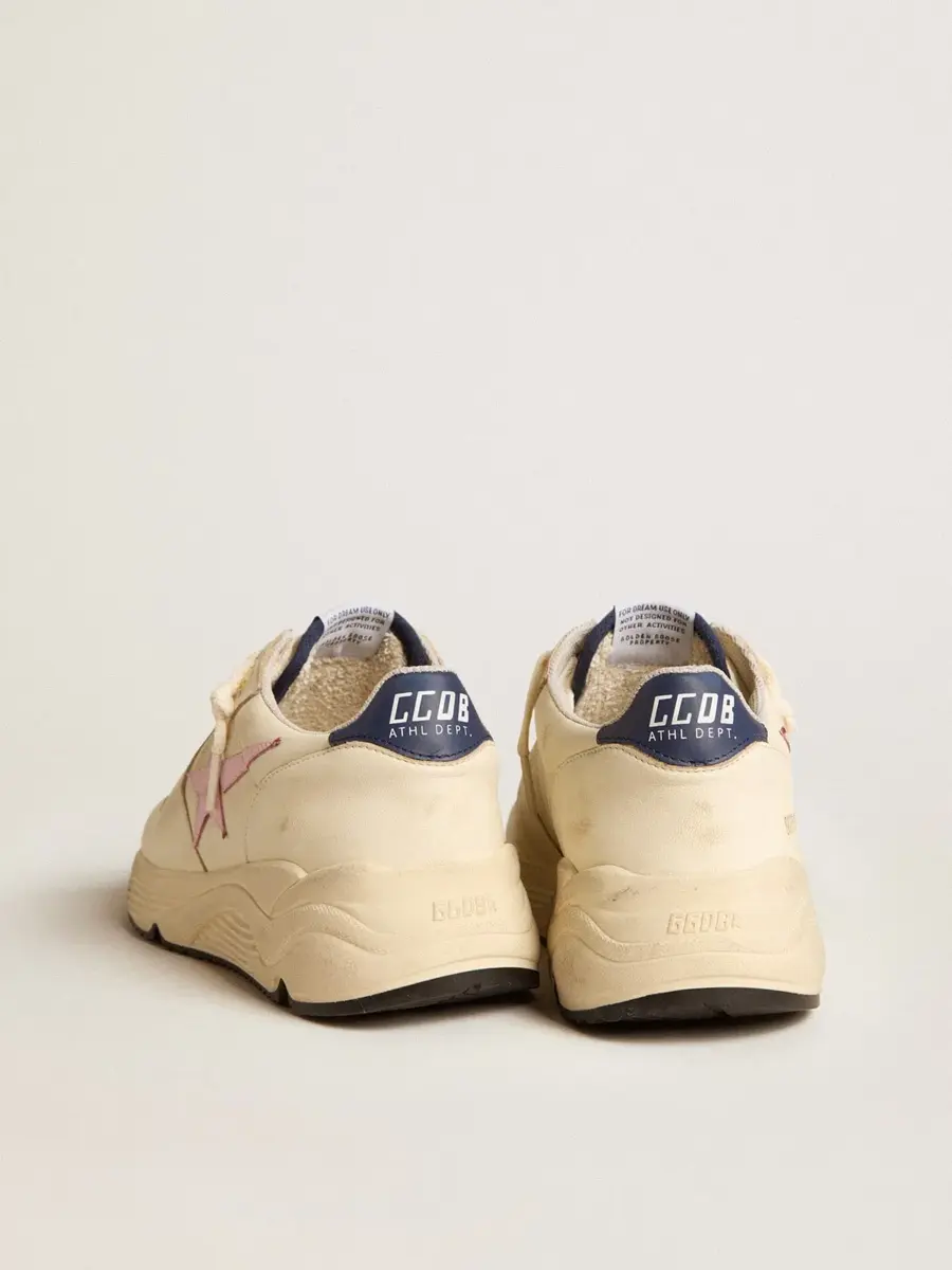 El estilo urbano y el espíritu artesanal se combinan en nuestras zapatillas Running Sole: la compañera ideal para tus aventuras metropolitanas. Este modelo presenta una parte superior de piel napa blanca acentuada con una estrella de piel rosa y una lengüeta en el talón de piel azul oscuro. La lengüeta de nubuck blanco y los cordones de color crema añaden el toque final.