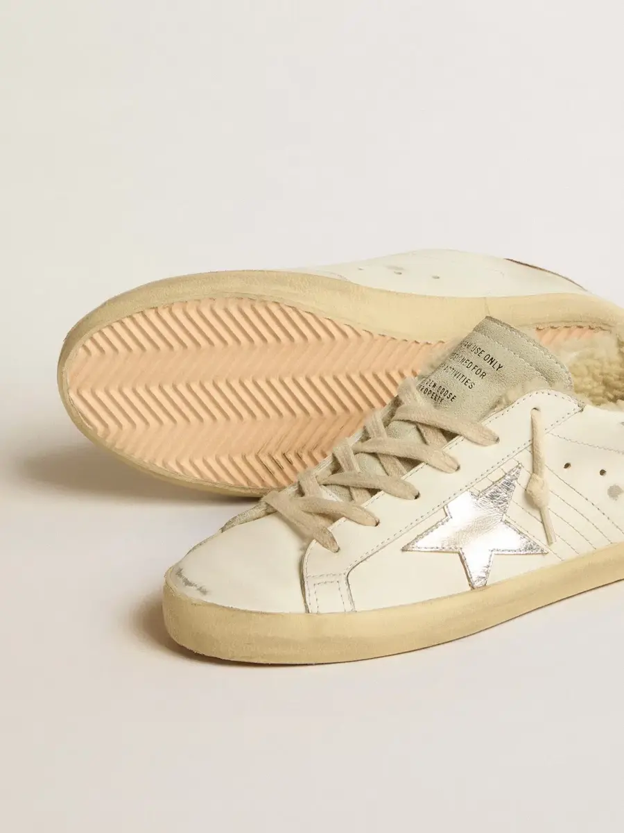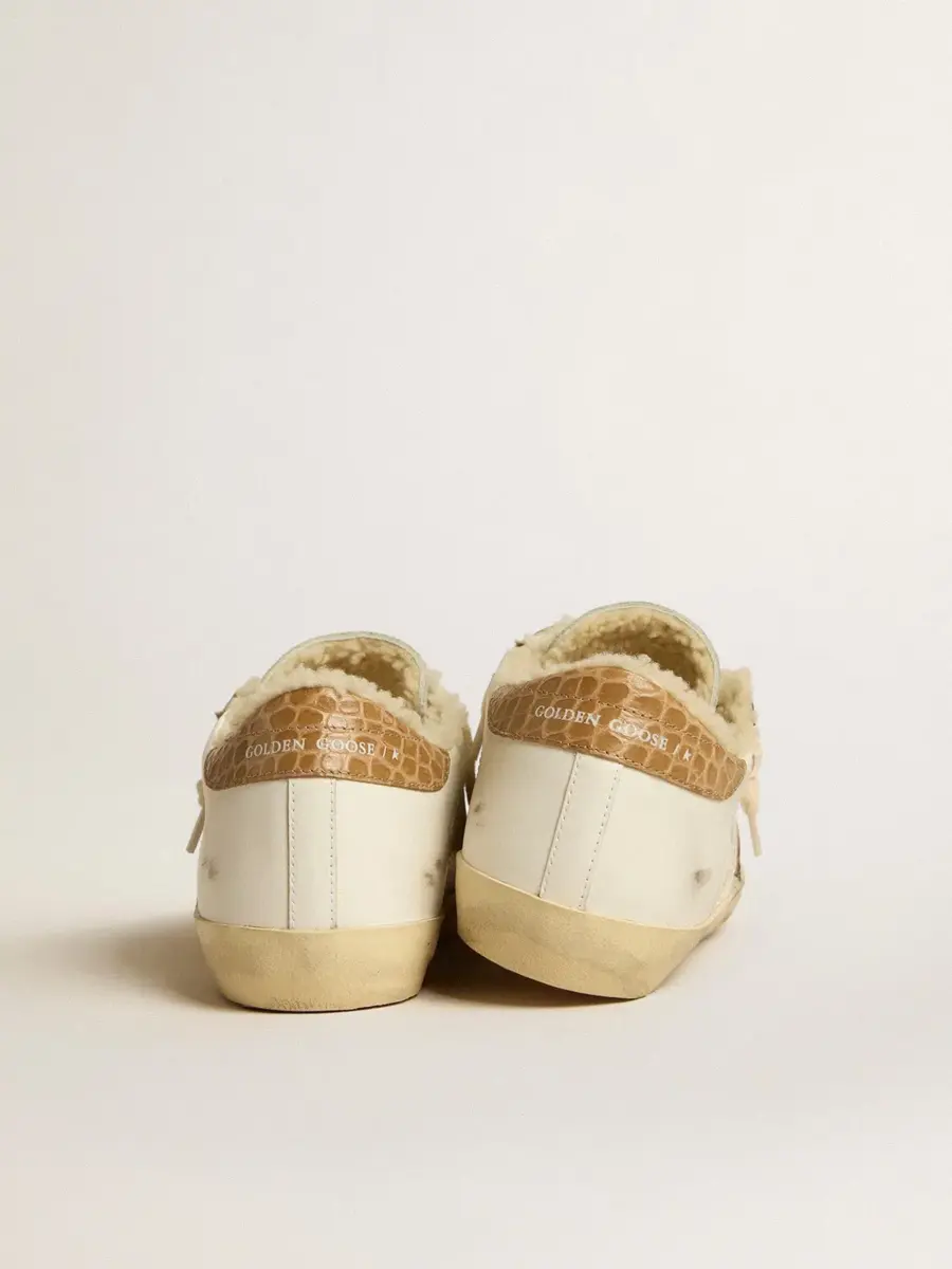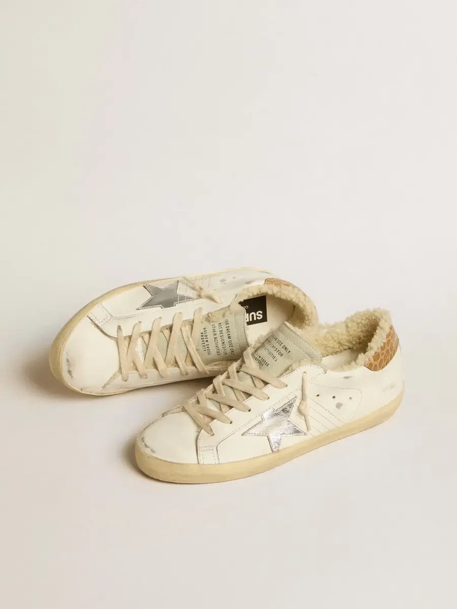 Un icono atemporal, pero en constante evolución. En Golden nos encanta retocar nuestros clásicos constantemente, siempre desde un nuevo ángulo. Estas zapatillas Super-Star de piel blanca con un suave forro de borreguillo beige cuentan con una estrella de piel metalizada plateada y una lengüeta en el talón de piel con estampado de cocodrilo en color tabaco. La lengüeta de ante gris hielo y los cordones beige añaden el toque final.