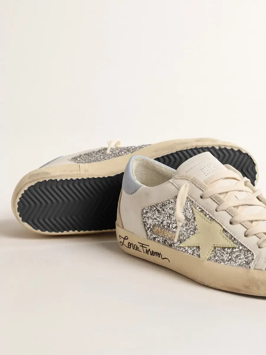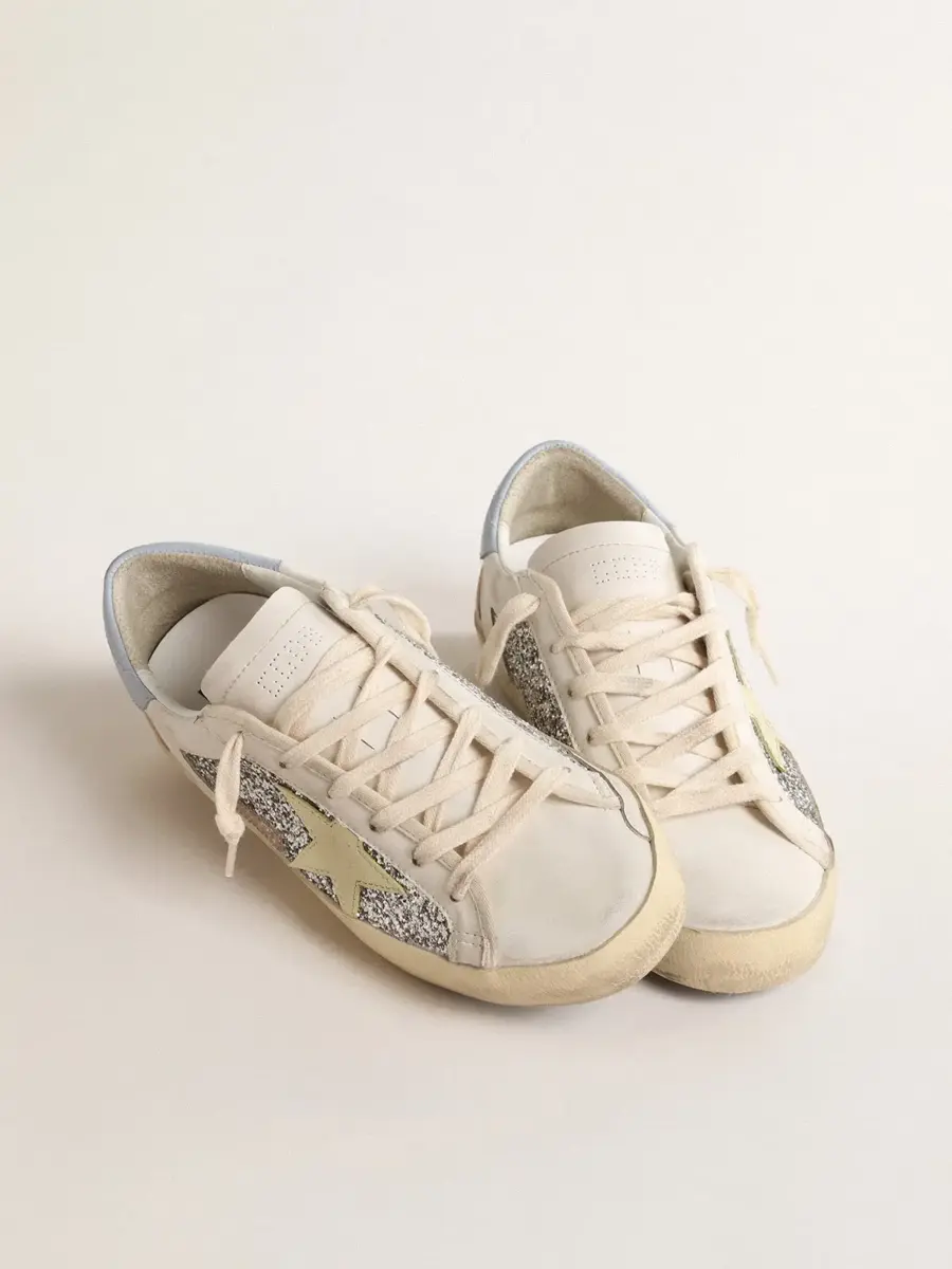Un icono atemporal que, sin embargo, está en constante evolución. En Golden, nos encanta tomar nuestros clásicos y reelaborarlos constantemente, siempre desde un nuevo ángulo. Con una parte superior blanca de origen biológico con inserciones de purpurina plateada, estas Super-Star cuentan con una estrella de cuero amarillo claro y una lengüeta de cuero azul claro en el talón. La inserción de ante beige en la parte trasera, las letras en contraste en el ribete y los cordones de color crema añaden el toque final.