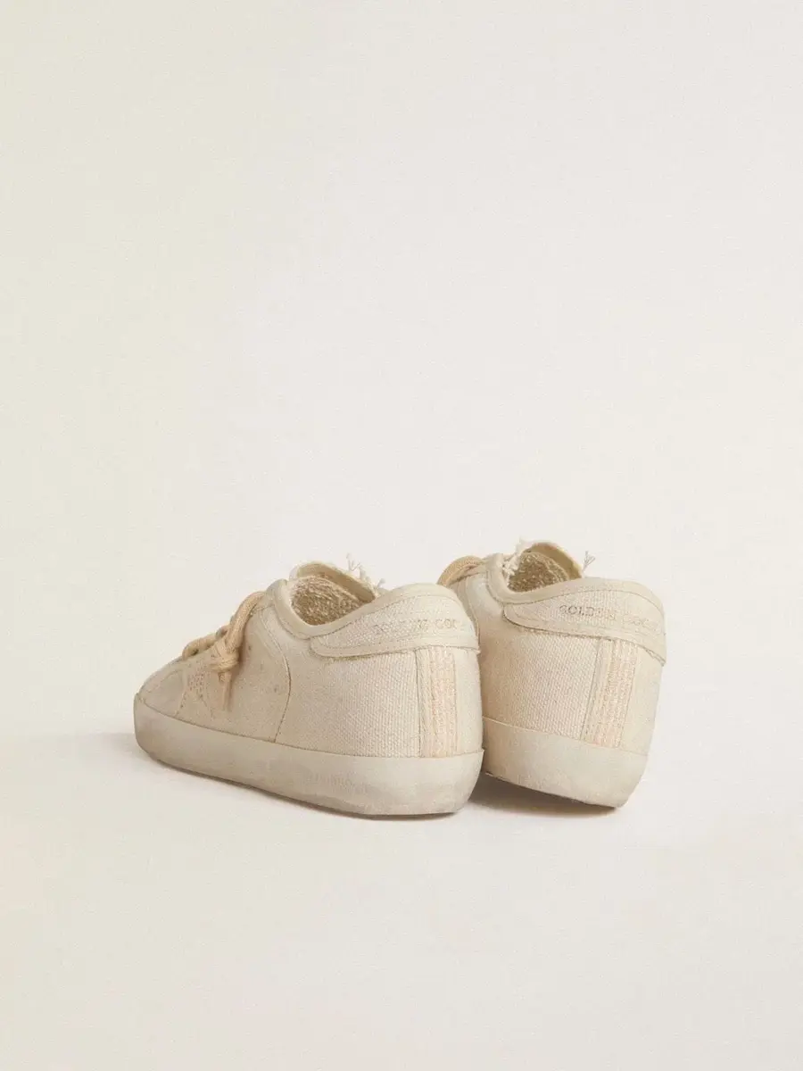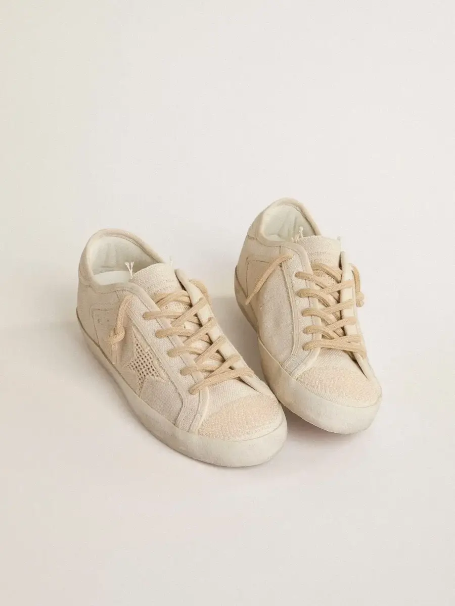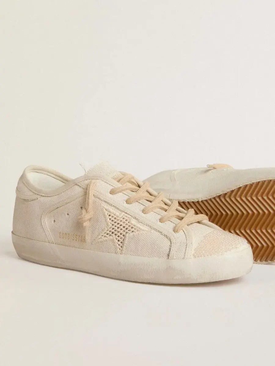 La colección Resort 2025 te invita a ralentizar el ritmo y disfrutar de la belleza natural de la vida mediterránea. Una celebración de las texturas vividas, los ritmos relajados y la elegancia discreta que se entreteje en los momentos más sencillos de la vida. Estas Super-Star con parte superior de lona color perla presentan una estrella con efecto de malla tono sobre tono y una lengüeta en el talón de lona color perla con ribetes de algodón tono sobre tono. La puntera con abalorios bordados en color perla y los cordones tubulares beige añaden el toque final.