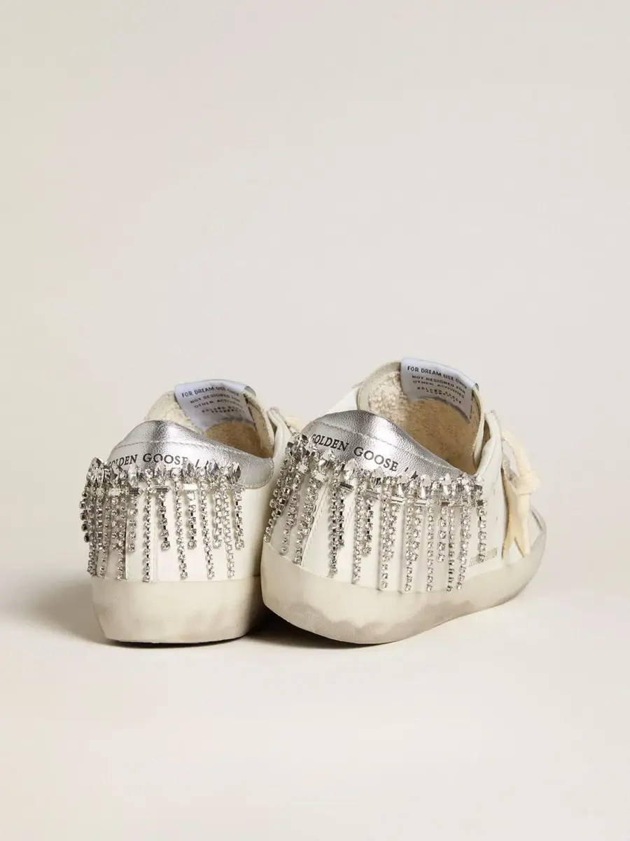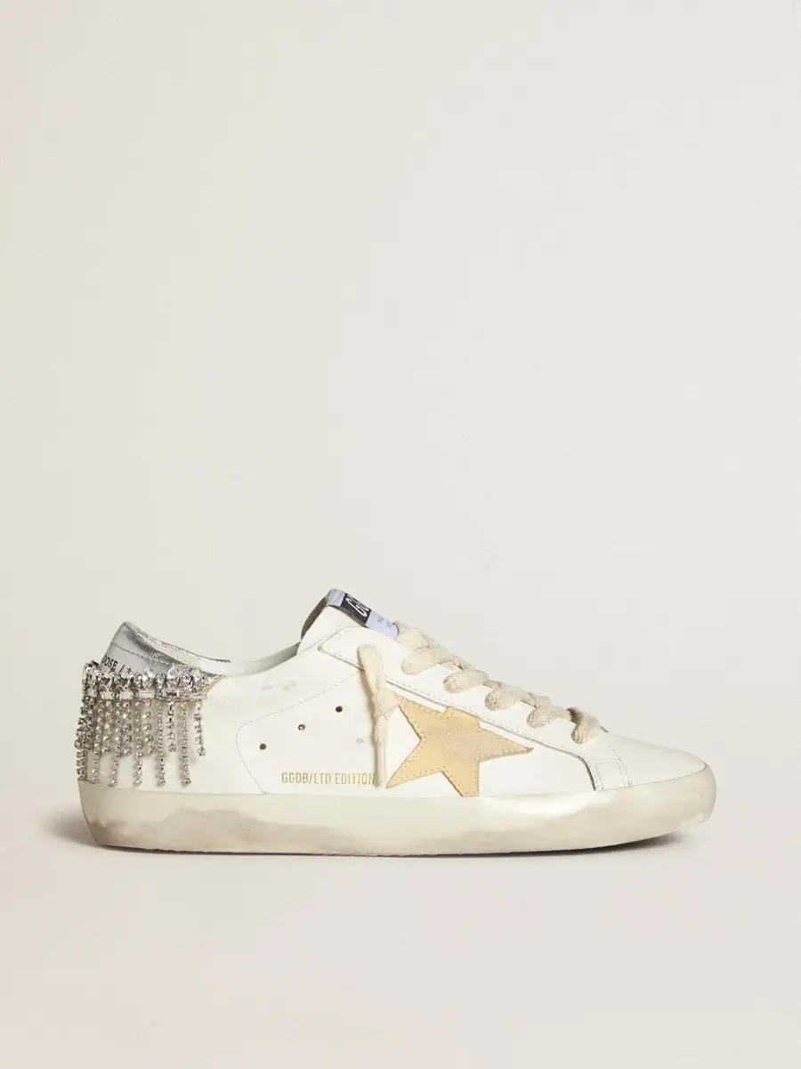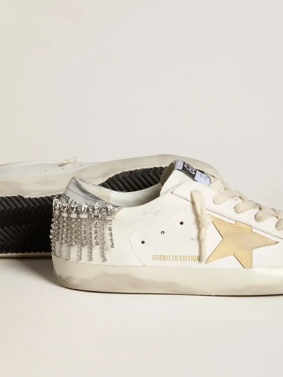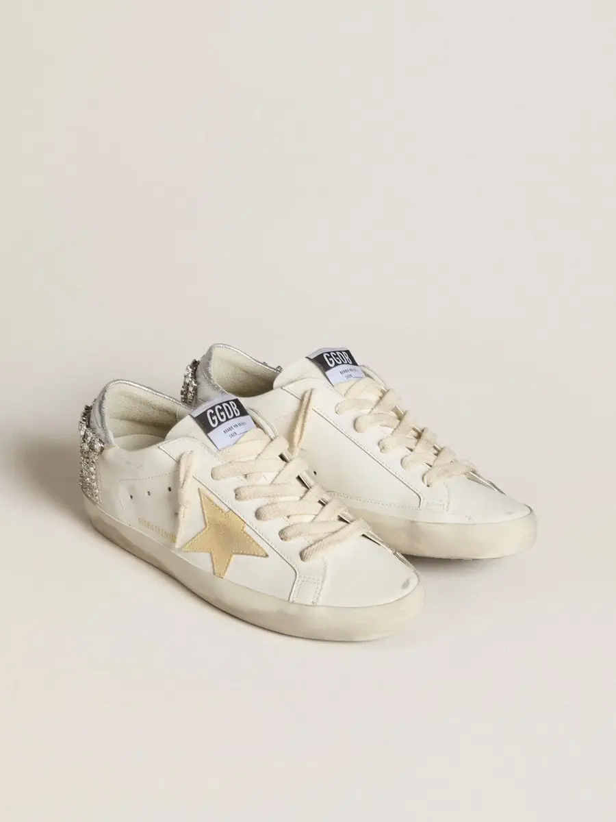 Un icono atemporal, pero en constante evolución. En Golden, nos encanta retocar nuestros clásicos constantemente, siempre desde un nuevo ángulo. Estas Super-Star con parte superior de piel blanca cuentan con una estrella de ante amarillo y una lengüeta de piel metalizada plateada adornada con cristales. Los cordones blancos añaden el toque final.