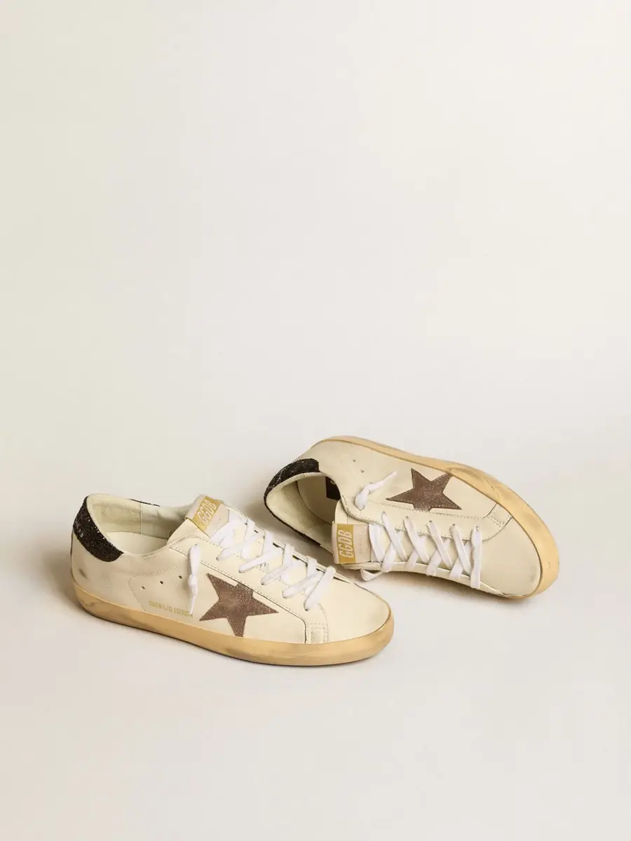 Un icono atemporal, pero en constante evolución. En Golden, nos encanta tomar nuestros clásicos y reelaborarlos constantemente, siempre desde un nuevo ángulo. Estas zapatillas Super-Star con parte superior de cuero blanco cuentan con una estrella de cuero metalizado marrón claro con efecto brillante y una lengüeta en el talón con purpurina negra. Los cordones blancos añaden el toque final.