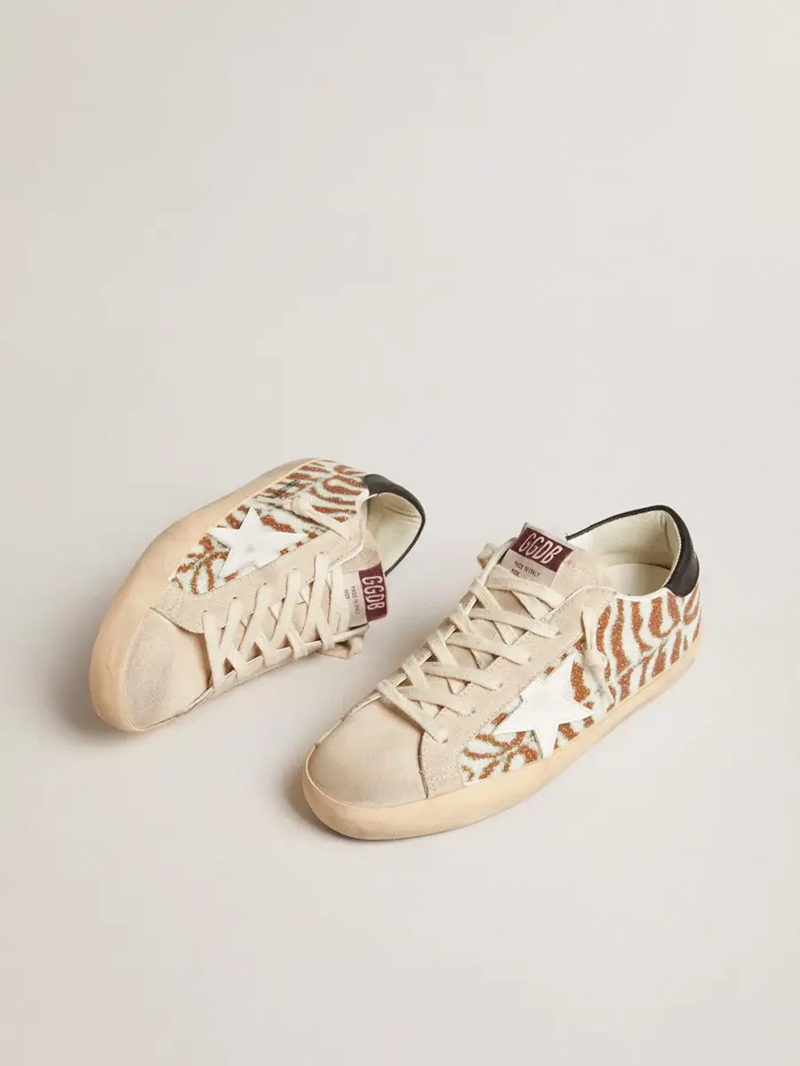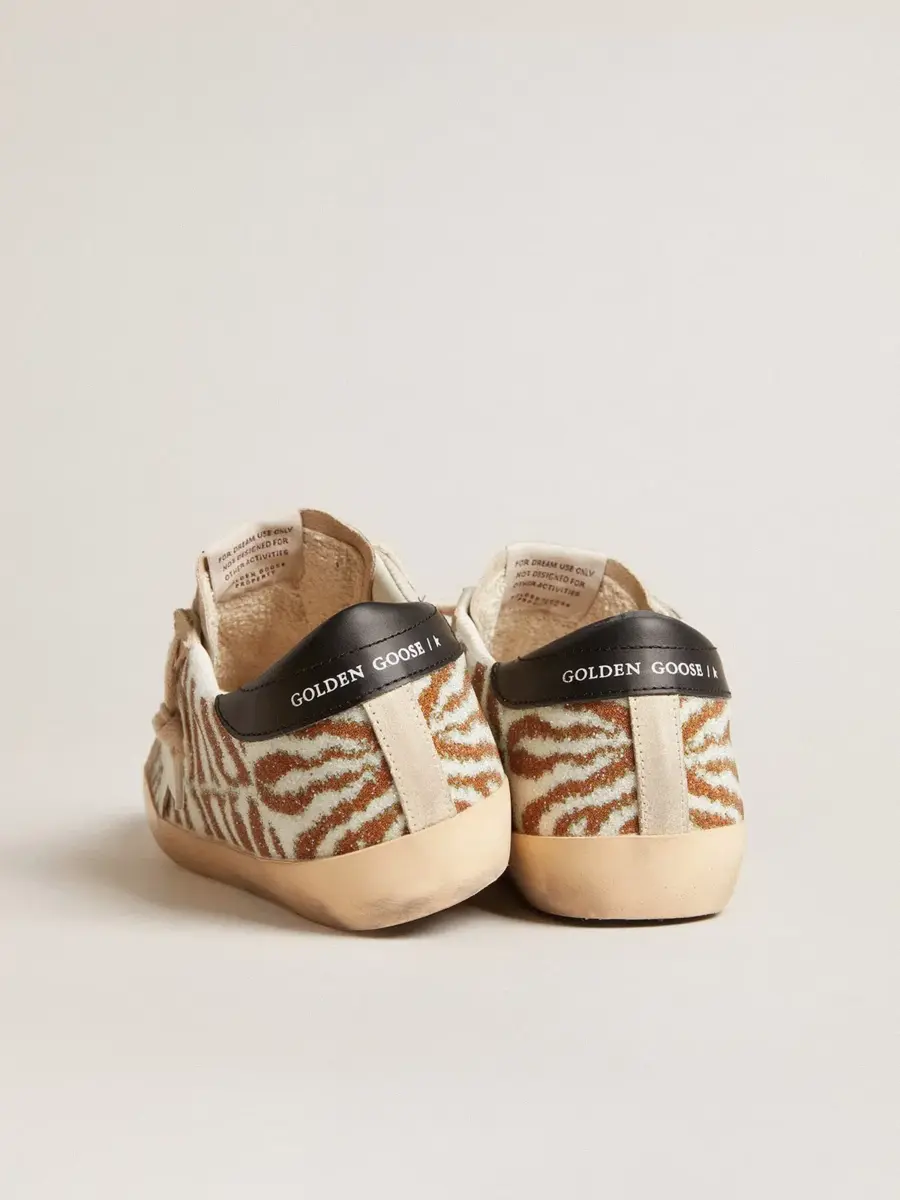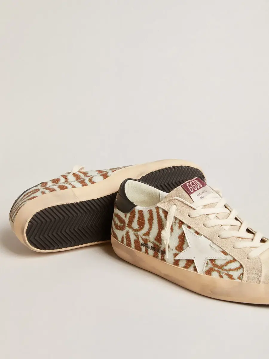 Un icono atemporal, pero en constante evolución. En Golden, nos encanta tomar nuestros clásicos y reelaborarlos constantemente, siempre desde un nuevo ángulo. Estas Super-Star con una parte superior de cristal Swarovski con efecto cebra blanco y tabaco cuentan con una estrella de cuero blanco y una lengüeta de cuero negro en el talón. La lengüeta y las inserciones de ante color perla y los cordones del mismo color añaden el toque final.