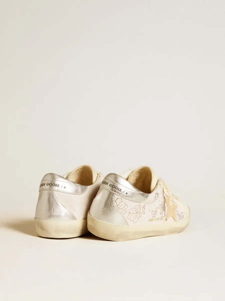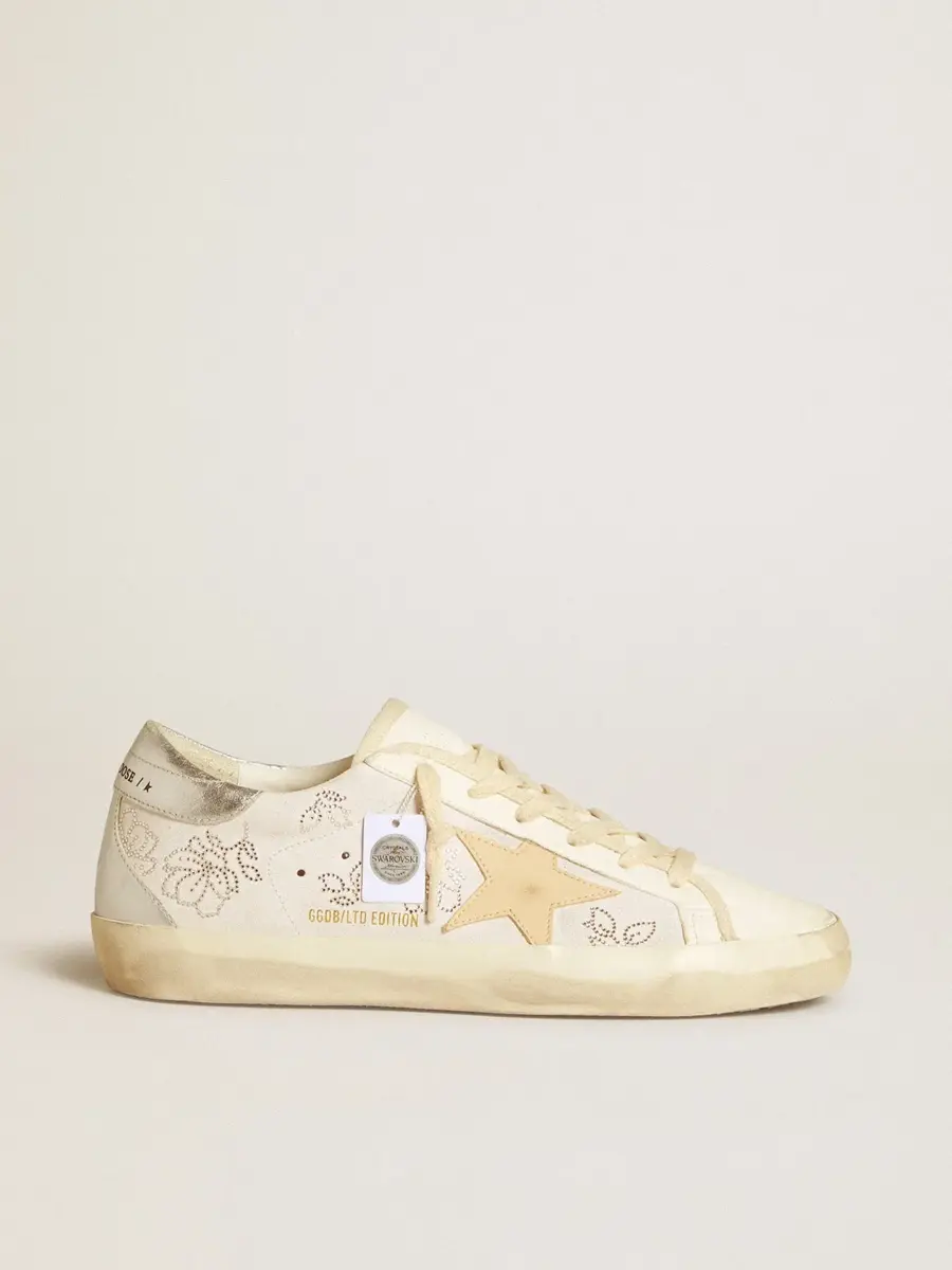 Un icono atemporal, pero en constante evolución. En Golden nos encanta retocar nuestros clásicos y renovarlos constantemente, siempre desde un nuevo punto de vista. Estas Super-Star, con una parte superior de piel blanca desgastada iluminada por cristales Swarovski, cuentan con una estrella de piel gris humo y una lengüeta y una inserción en el talón de piel metalizada plateada en la parte trasera. La lengüeta y las inserciones de piel napa blanca desgastada y los cordones blancos añaden el toque final.