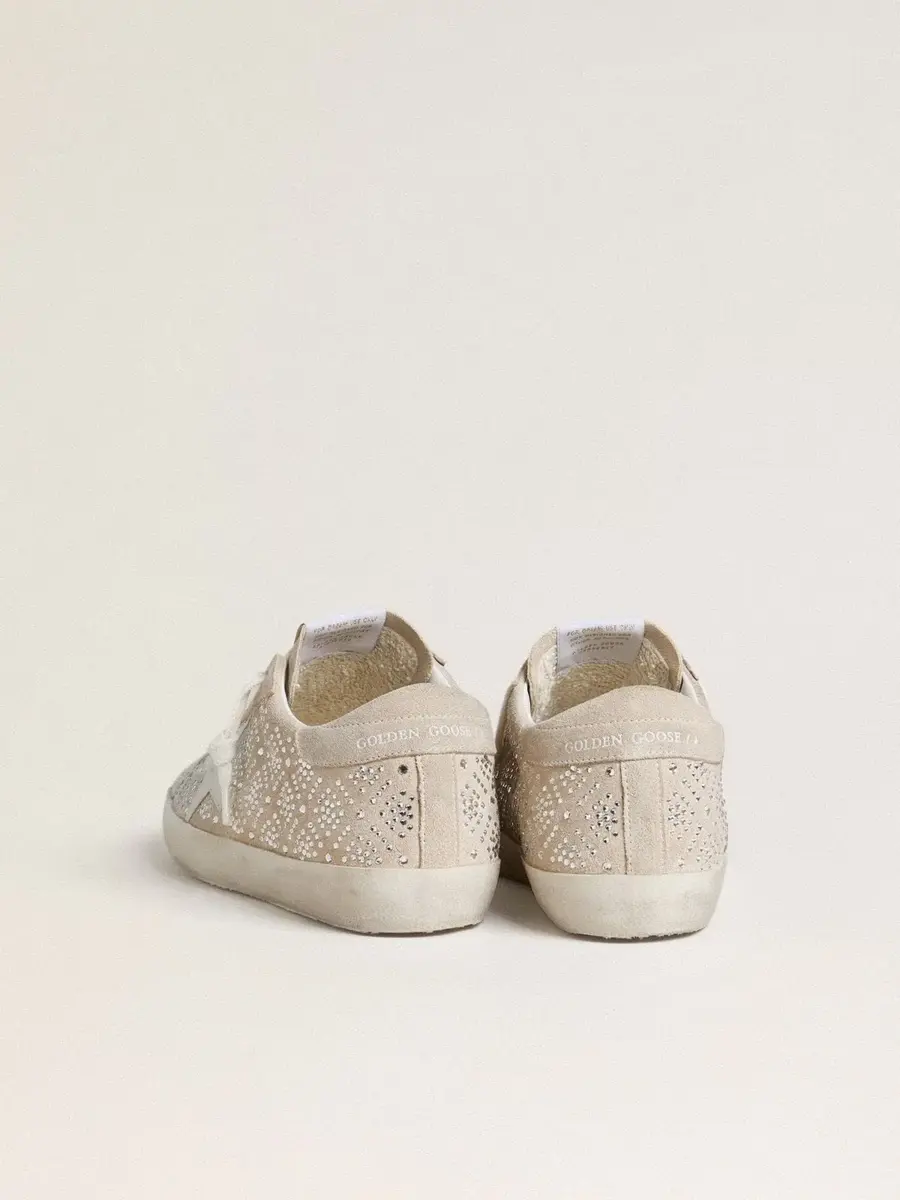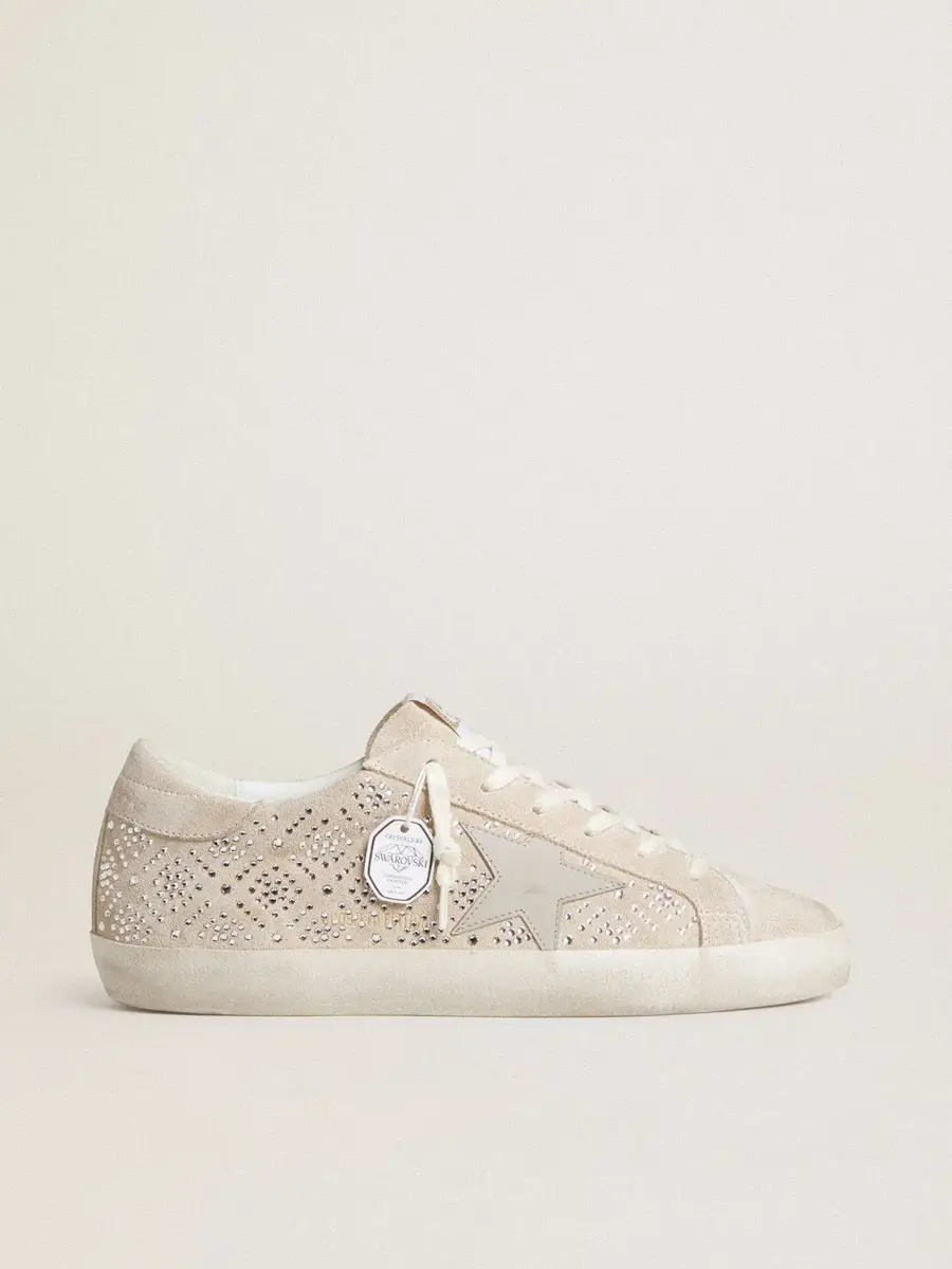Un icono atemporal, pero en constante evolución. En Golden nos encanta retocar nuestros clásicos constantemente, siempre desde un nuevo ángulo. Estas Super-Star, con una parte superior de ante rosa pálido iluminada con cristales Swarovski plateados, cuentan con una estrella de cuero gris hielo y una lengüeta de ante beige en el talón. Los cordones blancos añaden el toque final.