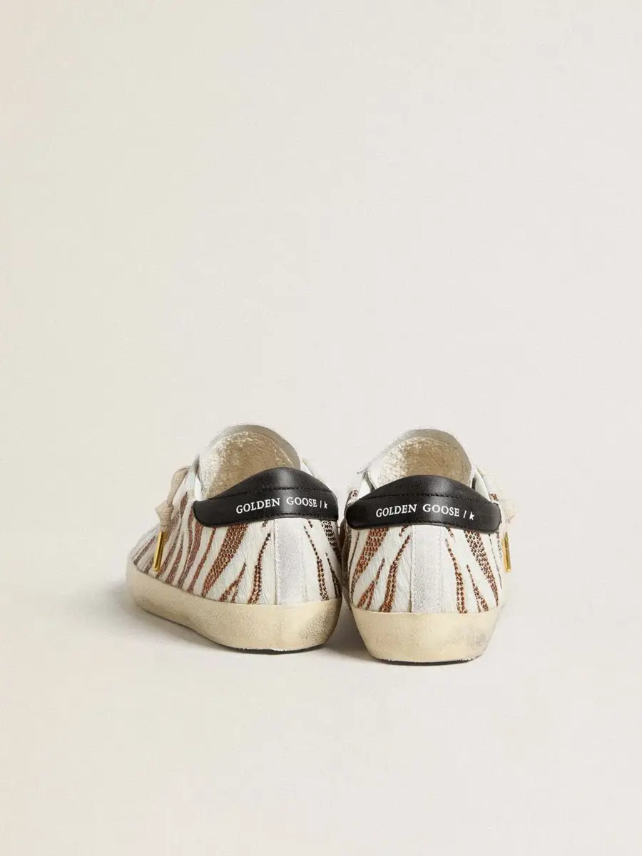 Un icono atemporal, pero en constante evolución. En Golden nos encanta retocar nuestros clásicos constantemente, siempre desde un nuevo ángulo. Estas Super-Star cuentan con una estrella de ante blanco y una lengüeta de cuero marrón en el talón, sobre una parte superior de piel de potro blanco con motivo de estampado de cebra en purpurina marrón. La lengüeta de ante blanco y los cordones de color crema añaden el toque final.