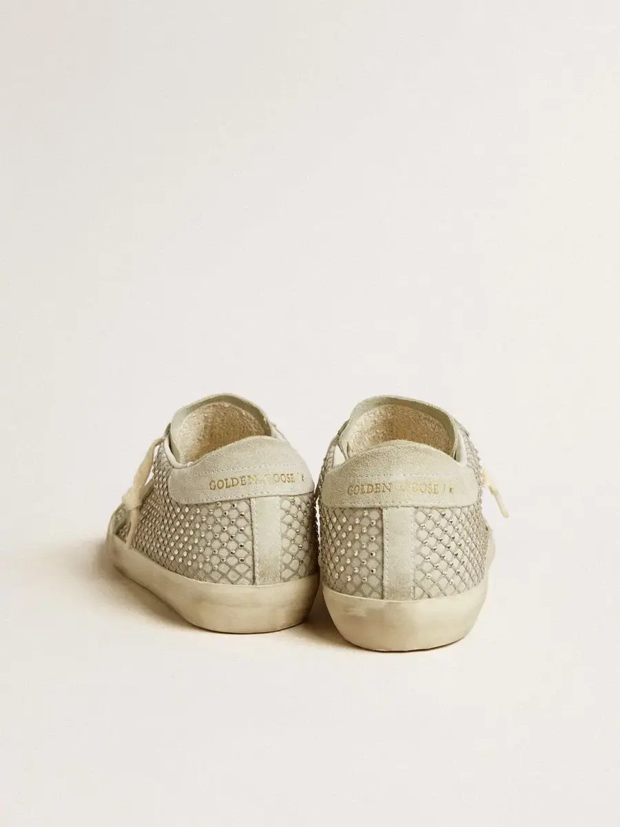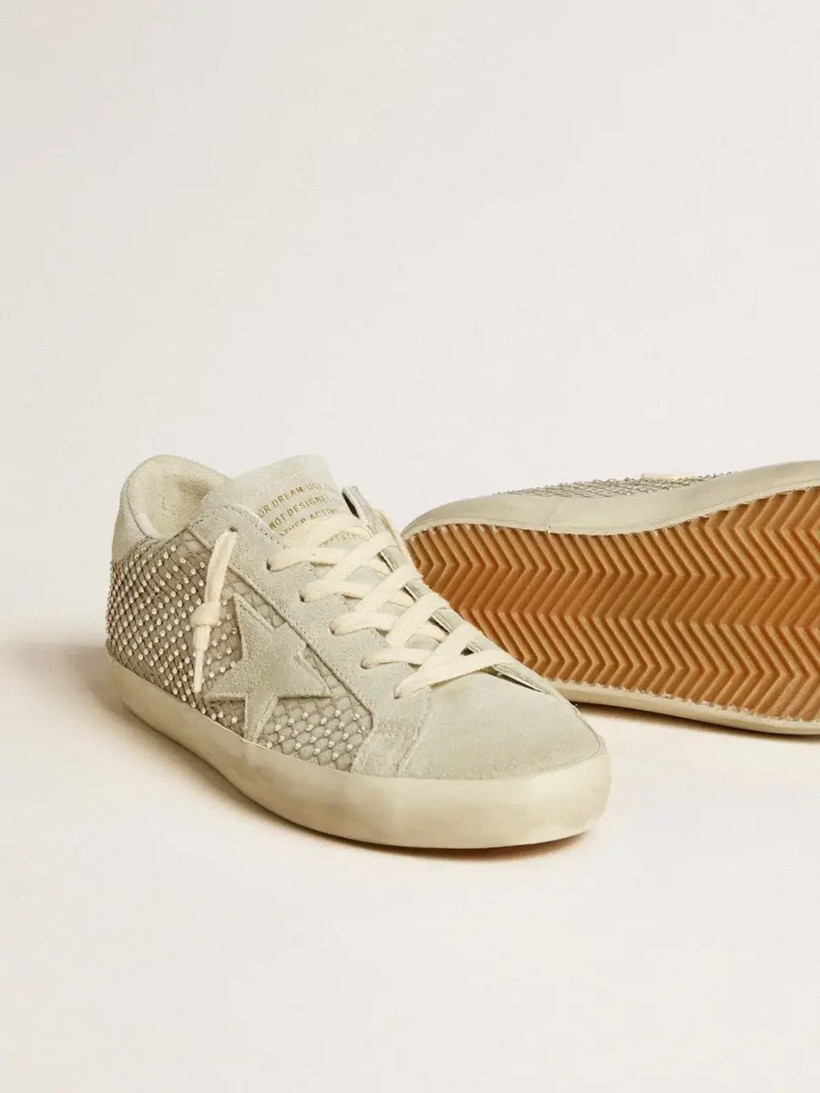 Un icono atemporal, pero en constante evolución. En Golden, nos encanta retomar nuestros clásicos y reelaborarlos constantemente, siempre desde un nuevo ángulo. Con una parte superior de ante gris iluminada con una malla de cristales Swarovski, estas Super-Star cuentan con una estrella y una lengüeta en el talón de ante gris. Los cordones color crema añaden el toque final.