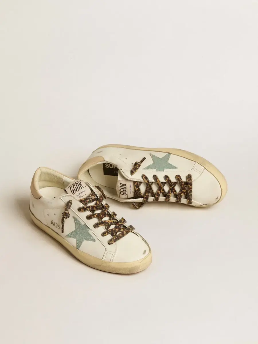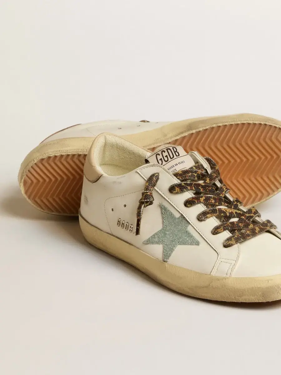 Un icono atemporal, pero en constante evolución. En Golden nos encanta retocar nuestros clásicos constantemente, siempre desde un nuevo ángulo. Estas zapatillas Super-Star con parte superior de piel blanca cuentan con una estrella brillante gris pálido y una lengüeta de piel nude en el talón. Las letras metálicas plateadas galvanizadas y los cordones con estampado de leopardo en tonos beige y marrón añaden el toque final.
