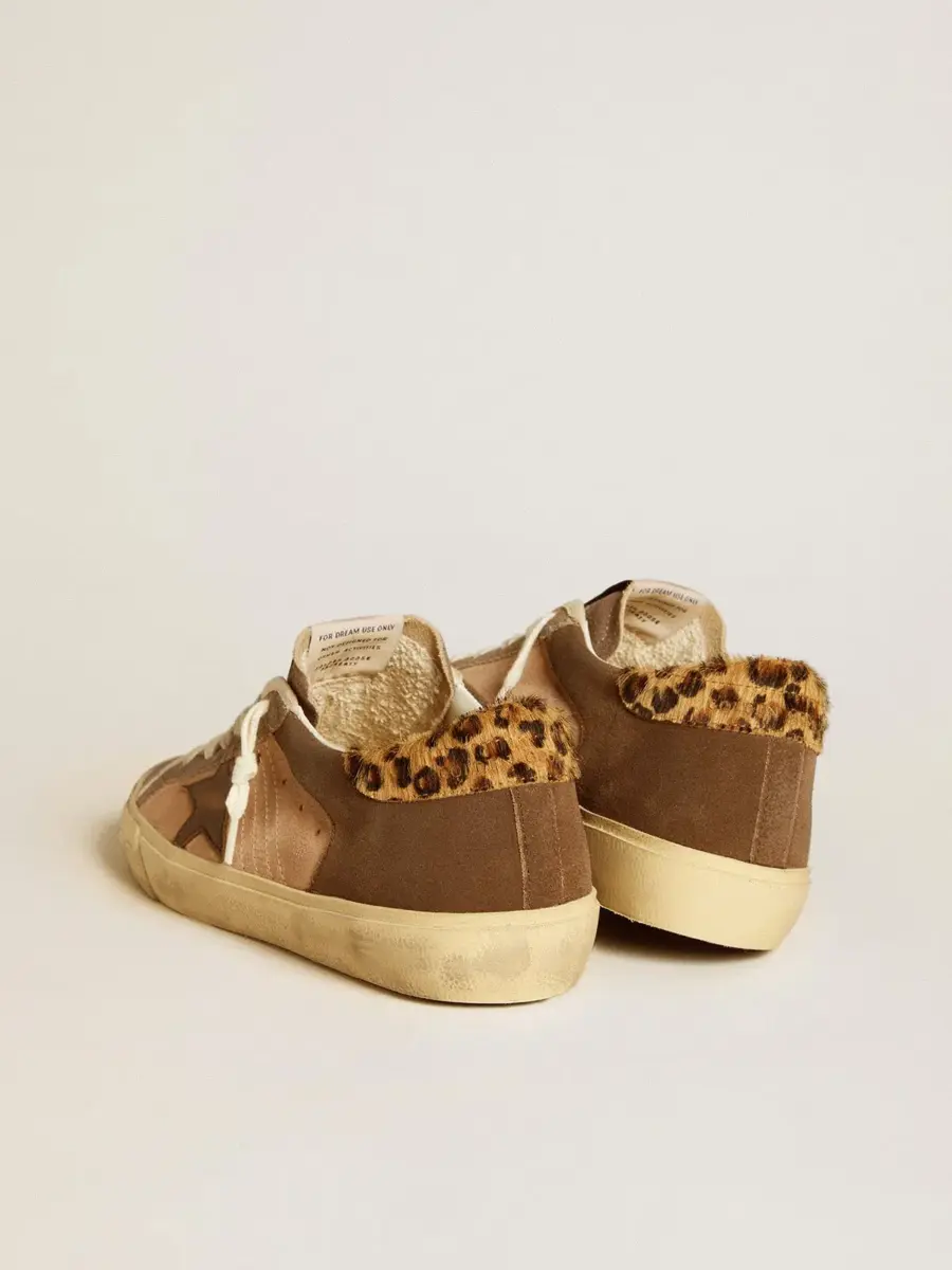 Un icono atemporal, pero en constante evolución. En Golden nos encanta retocar nuestros clásicos constantemente, siempre desde un nuevo ángulo. Con una parte superior de ante rosa claro y marrón, estas Super-Star cuentan con una estrella de cuero marrón, una lengüeta en el talón de piel de potro con estampado de leopardo en tonos beige y marrón, e inserciones de ante marrón claro. El ribete de algodón color crema y los cordones del mismo color añaden el toque final.