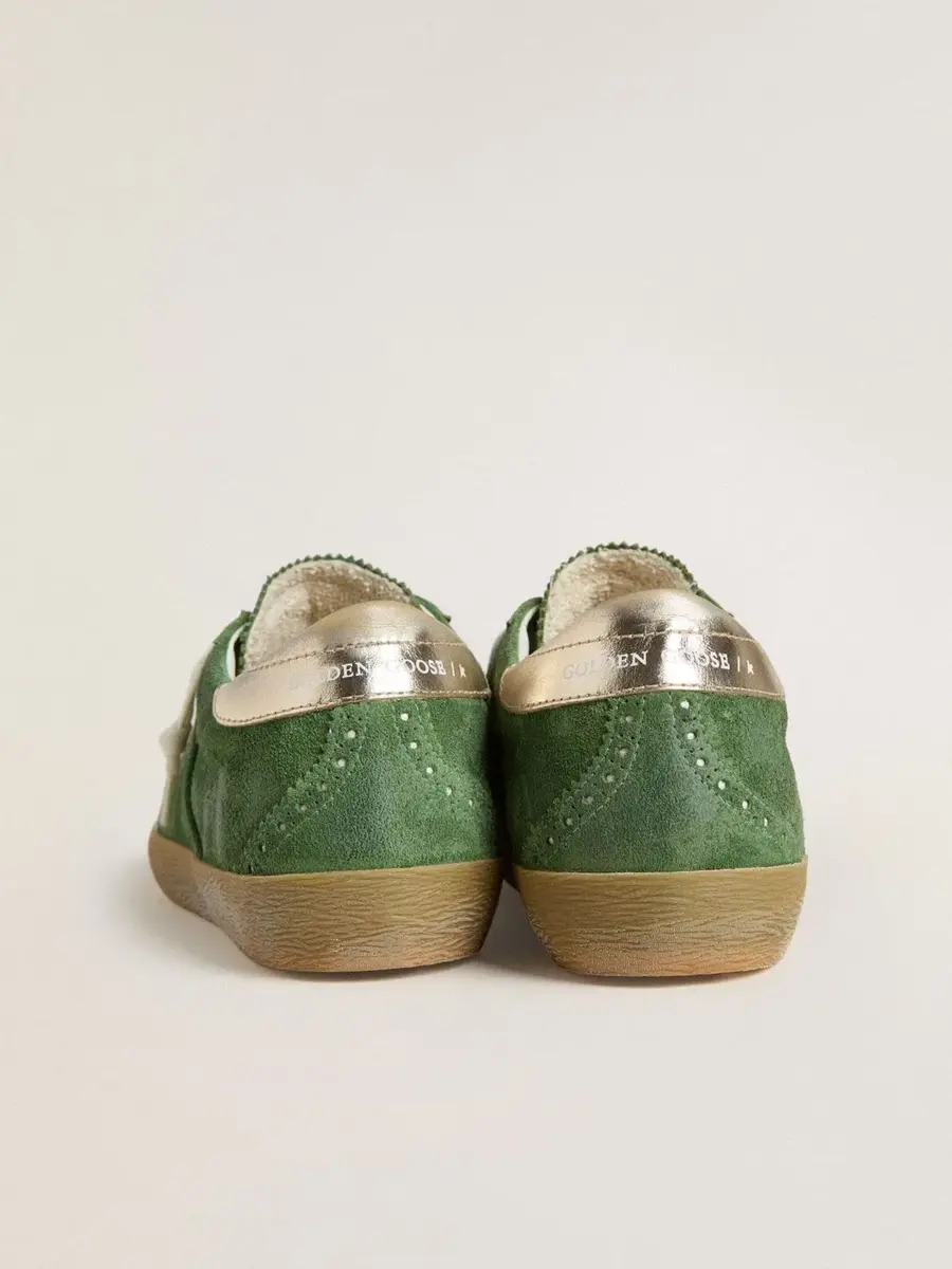 Un icono atemporal, pero en constante evolución. En Golden nos encanta retocar nuestros clásicos constantemente, siempre desde un nuevo ángulo. Estas Super-Star con parte superior de ante verde cuentan con una estrella de cuero blanco y una lengüeta trasera de cuero metalizado dorado. Los cordones blancos añaden el toque final.