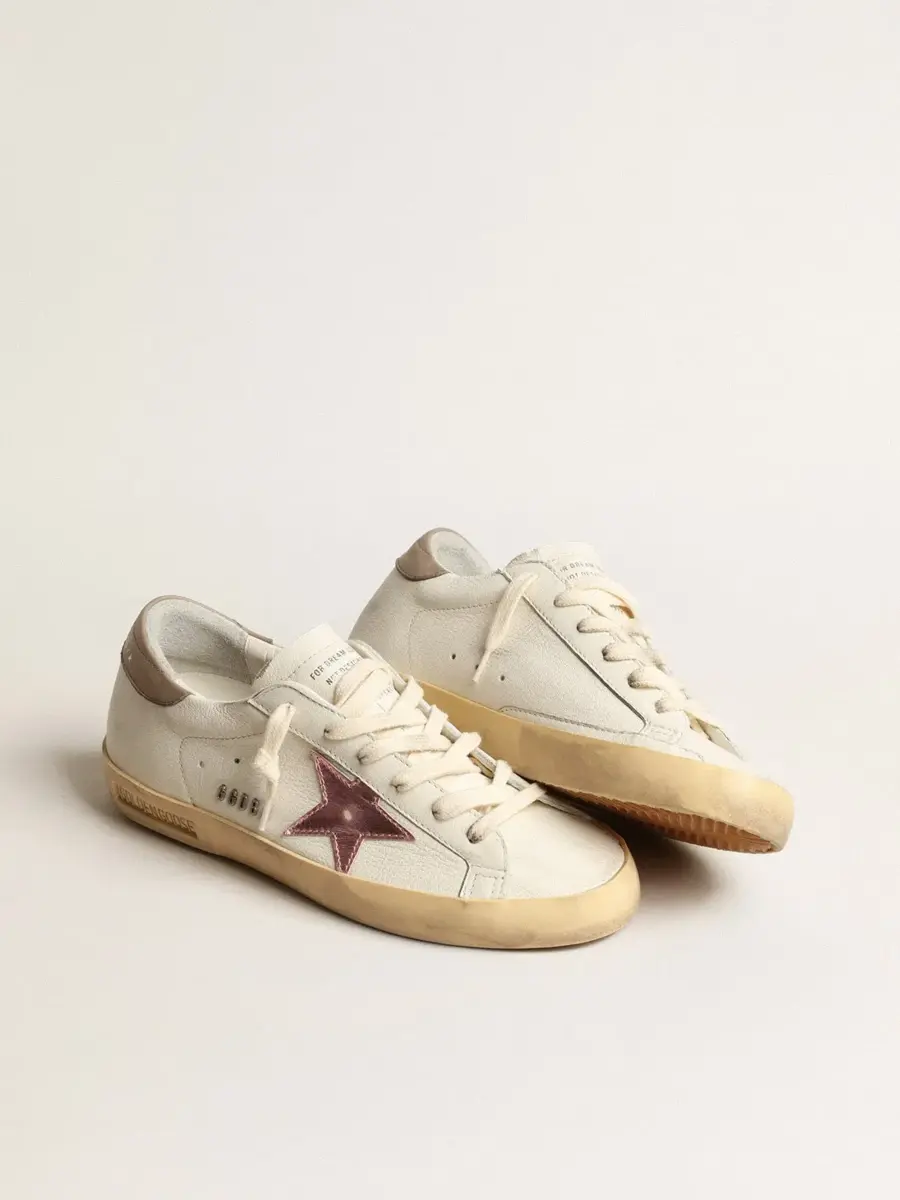 Un icono atemporal, pero en constante evolución. En Golden nos encanta retocar nuestros clásicos constantemente, siempre desde un nuevo ángulo. Estas Super-Star con parte superior de napa blanca cuentan con una estrella de cuero metalizado rosa antiguo y una lengüeta de cuero gris paloma en el talón. Las letras GGDB en metal plateado galvanizado y los cordones de color crema añaden el toque final.
