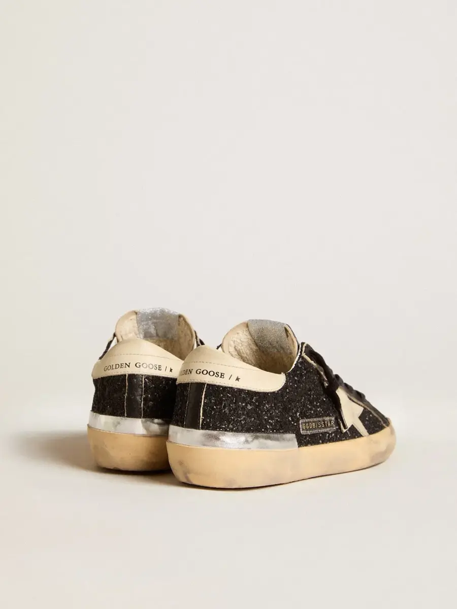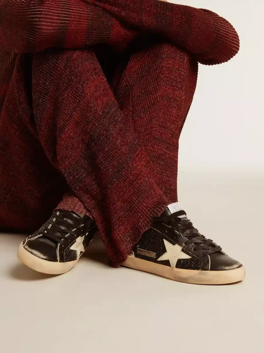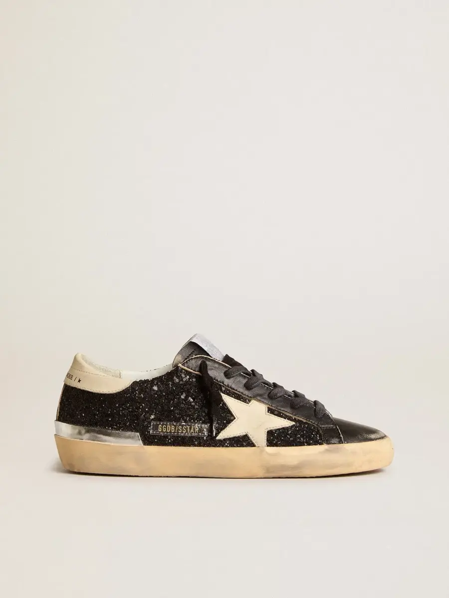 Un icono atemporal, pero en constante evolución. En Golden nos encanta retocar nuestros clásicos y renovarlos constantemente, siempre desde un nuevo punto de vista. Con una parte superior negra brillante acentuada con inserciones de piel napa negra, estas Super-Star cuentan con una estrella y una lengüeta en el talón de piel color crema. El ribete plateado y los cordones negros añaden el toque final.