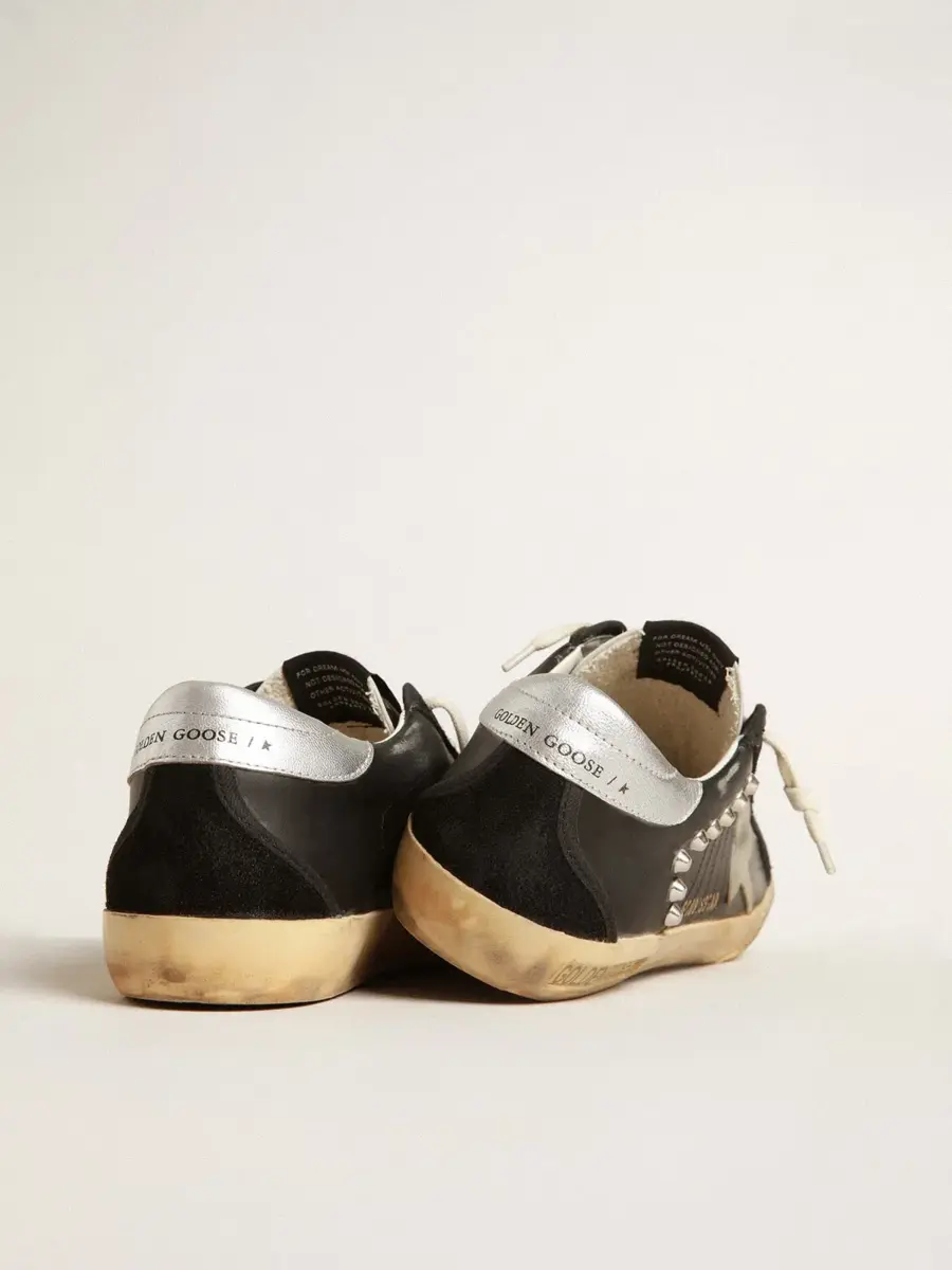 Un icono atemporal, pero en constante evolución. En Golden, nos encanta retocar nuestros clásicos constantemente, siempre desde un nuevo ángulo. Con una parte superior de cuero negro acentuada con inserciones de ante tono sobre tono, estas Super-Star para mujer cuentan con una estrella de ante gris paloma, una lengüeta de cuero metalizado plateado en el talón y tachuelas plateadas. El ribete de algodón negro en espiga y los cordones de color crema añaden los toques finales.
