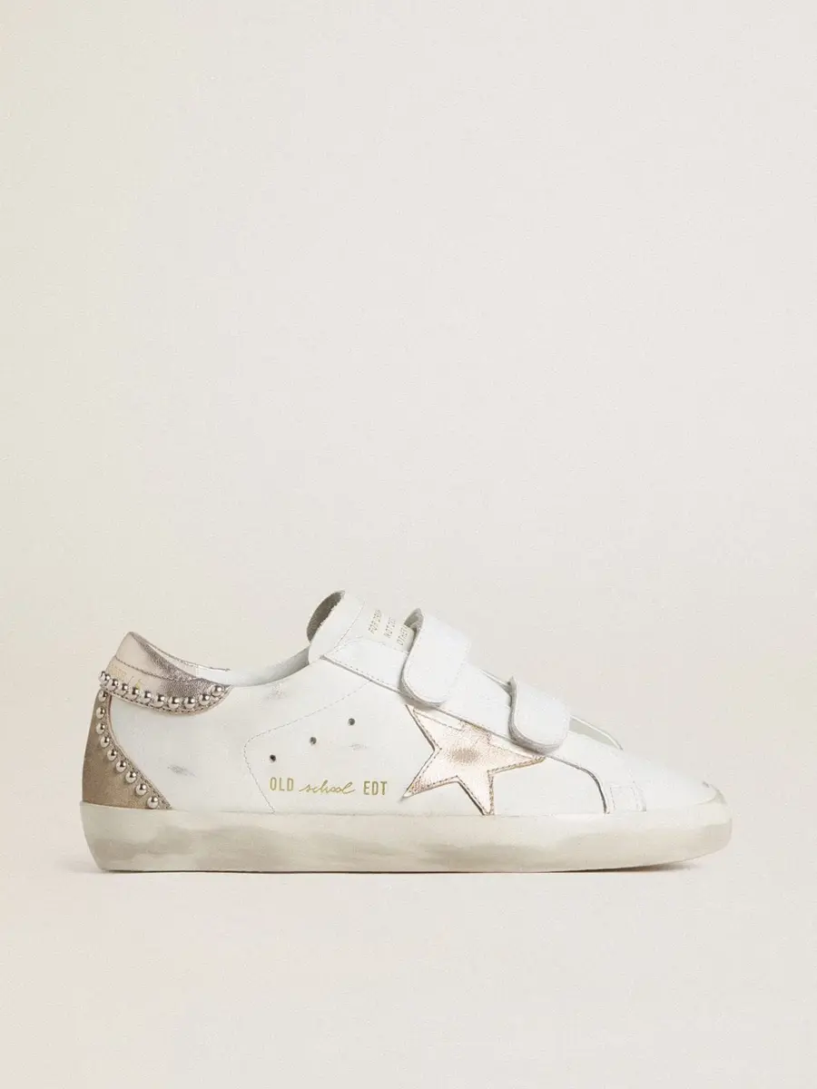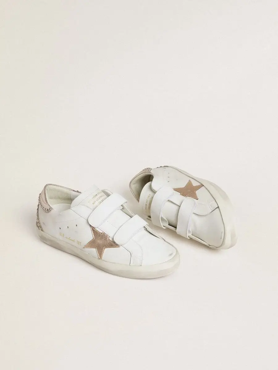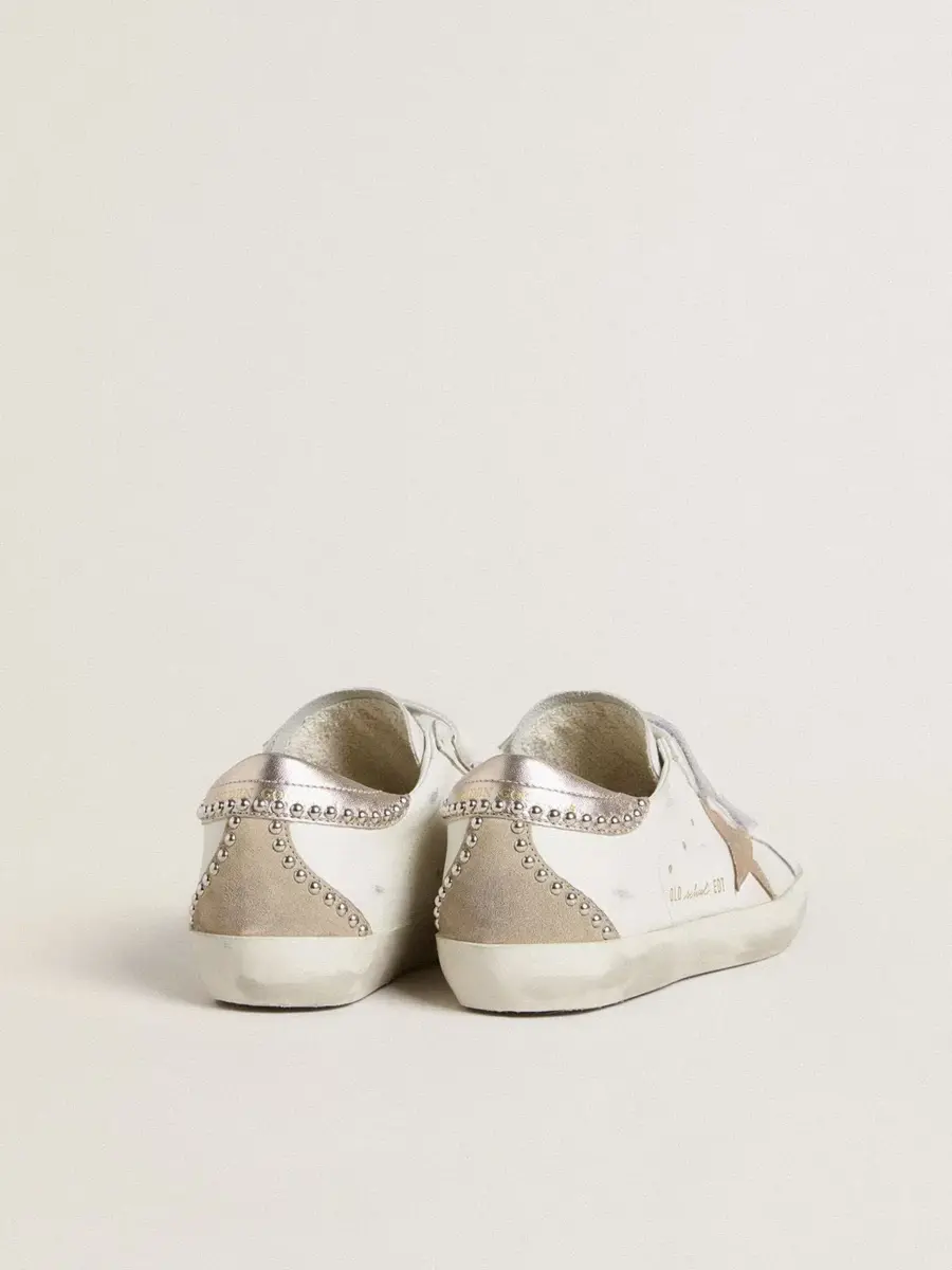 Nuestras zapatillas Old School cuentan con dos tiras de velcro en la parte delantera con el logotipo en contraste. Este modelo de piel blanca presenta una estrella y una lengüeta en el talón de piel laminada en oro rosa y una inserción de ante beige. Los tachones plateados en la parte trasera añaden el toque final.