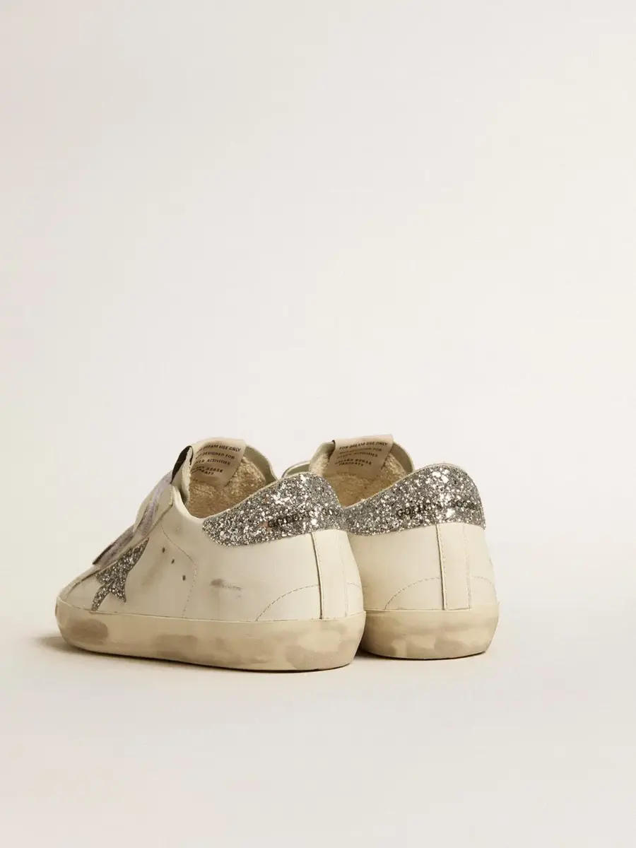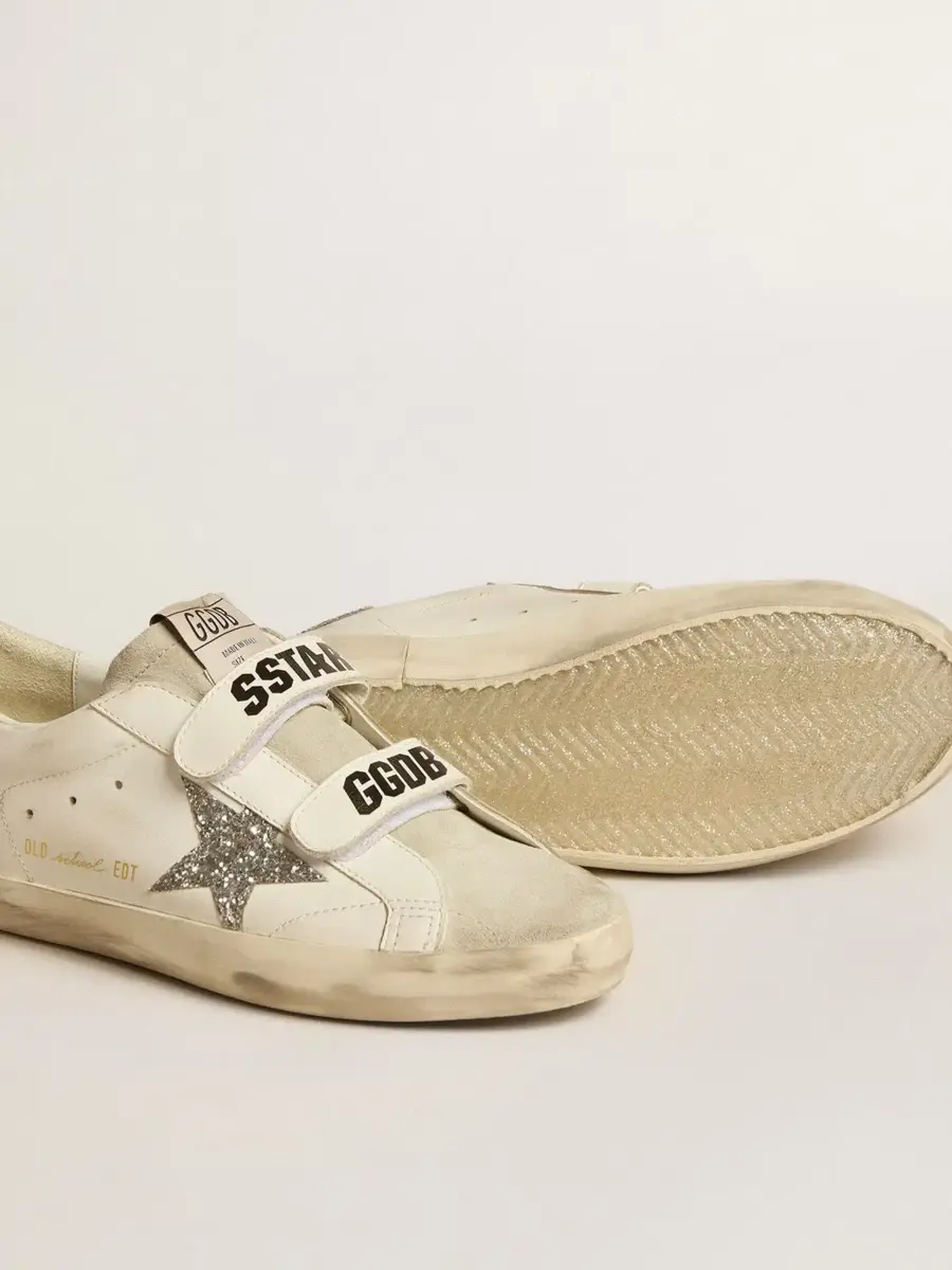 Nuestras zapatillas Old School cuentan con dos tiras de velcro en la parte delantera con el logotipo en contraste. Este modelo para mujer en piel blanca cuenta con una estrella plateada brillante y una lengüeta en el talón. La lengüeta de ante gris hielo le da el toque final.