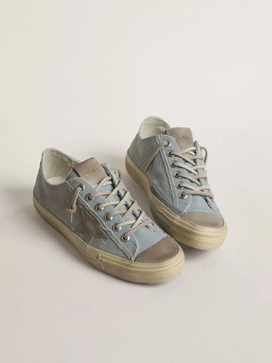 La belleza reside en la simplicidad: en nuestras zapatillas V-Star, una forma esencial se combina con detalles elegantes. Este modelo con parte superior de lona azul claro presenta una estrella de cuero gris paloma. Los cordones blancos añaden un toque elegante.