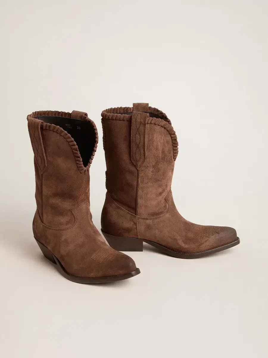 De Texas a Venecia: nuestras botas Wish Star cuentan nuestra trayectoria y nuestras pasiones, creando una combinación única entre la tradición artesanal veneciana y el espíritu cowboy. En esta versión baja, estas botas presentan una parte superior de ante lavado marrón oscuro con una estrella incrustada y costuras tono sobre tono en la pierna y la puntera. El detalle de ribete tono sobre tono y la placa metálica dorada con la firma Golden Goose grabada en el talón completan el look.